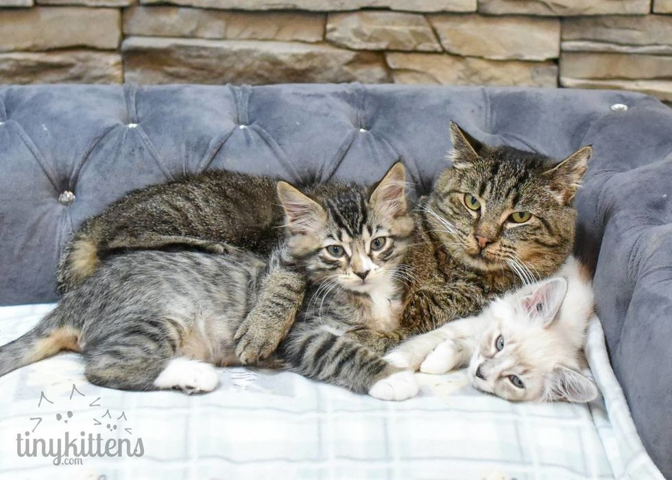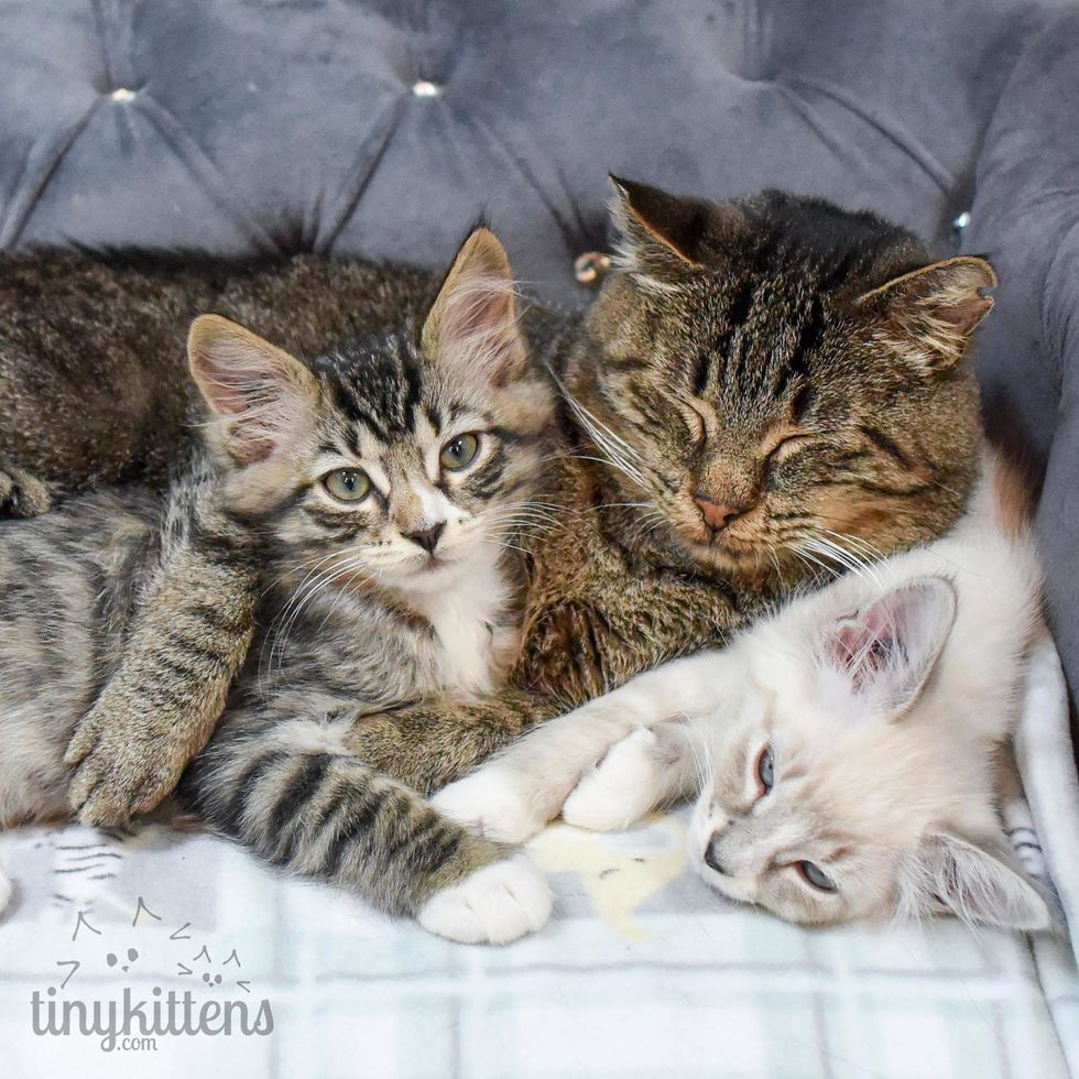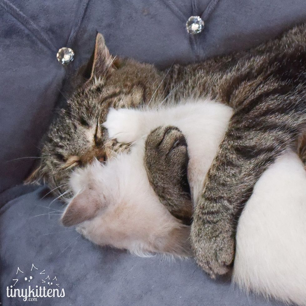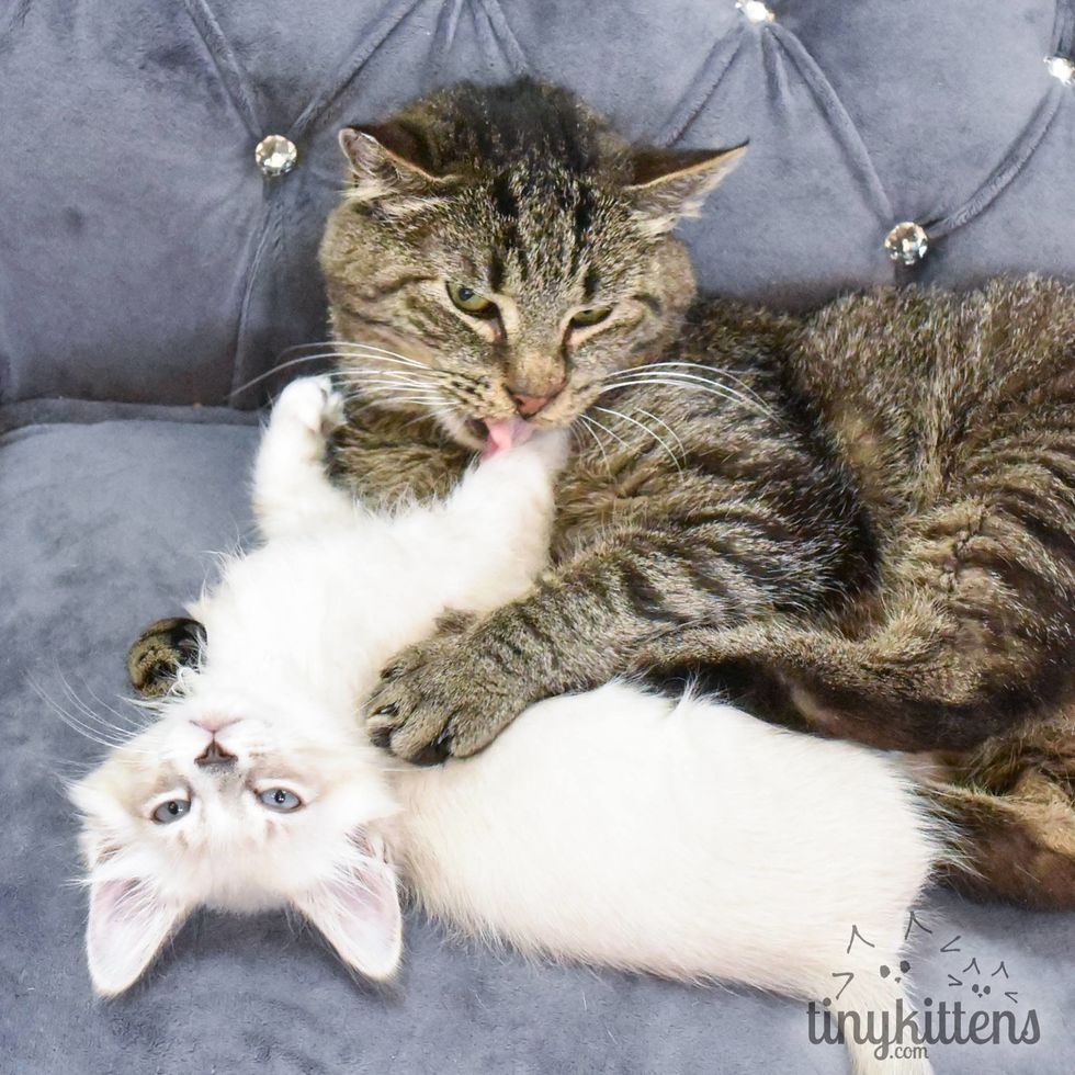 The rescue group refused to give up on him despite his health conditions and "fierceness". One day, they brought in some foster kittens to keep Grandpa company. To their surprise, it unleashed the tender and loving side of him, and Grandpa Mason completely came around. (Scroll down for video)