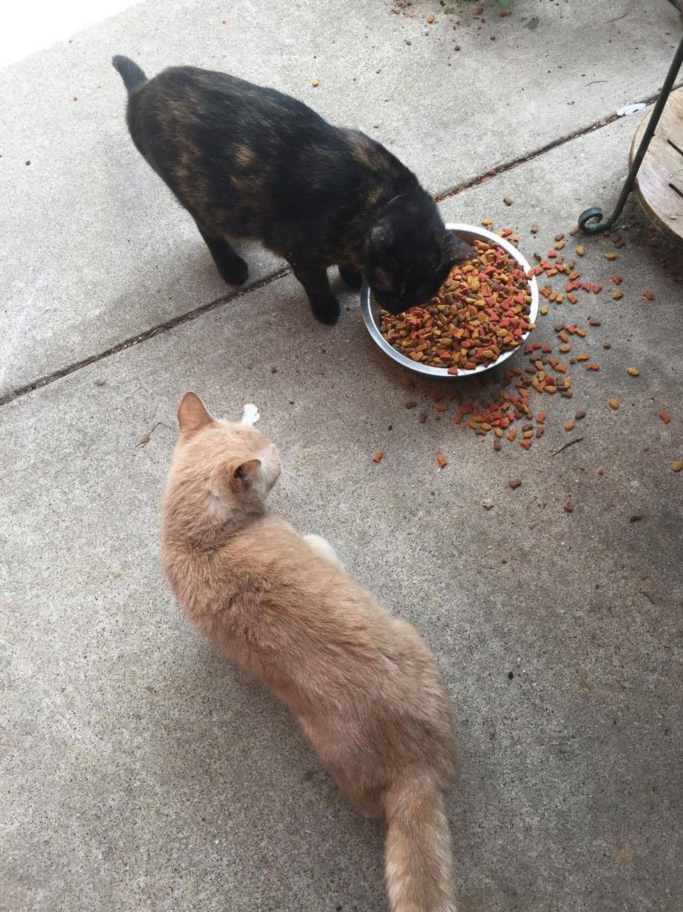 Porchy the tortie is the resident guard cat at the Kitty Adventure Rescue League. One day, she was seen with a furry friend in the yard, who decided to hang out and share some of her food.