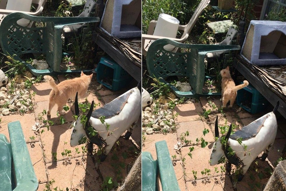 A resident guard cat at a cat sanctuary in Fort Worth, Texas brought home a boyfriend, a stray ginger, who wanted some food and a loving home.