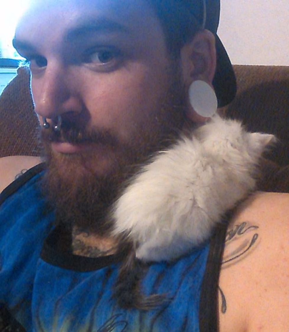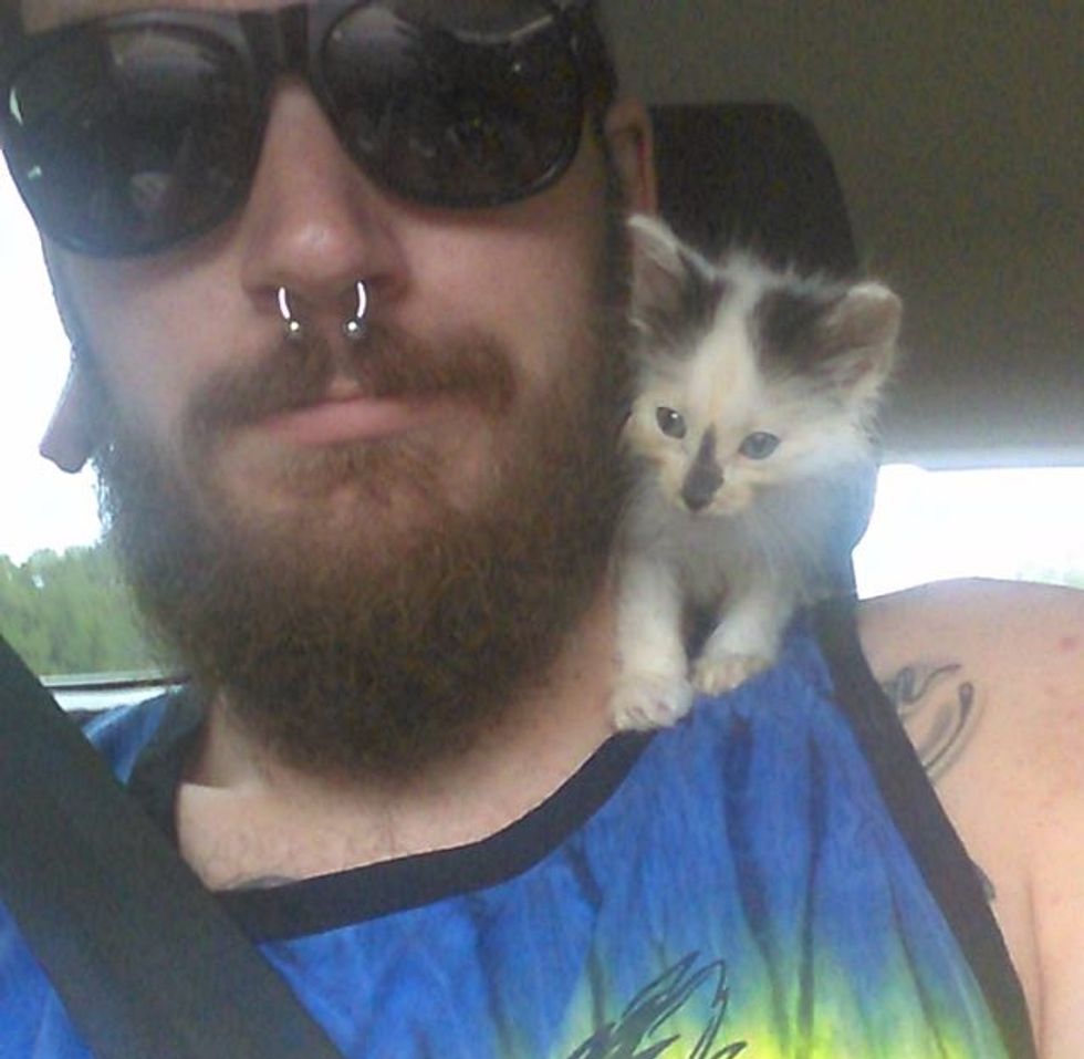 "So the little floof you see on my shoulder is a kitten who so far has had a pretty rough life. Luckily though we are able to give him a good one. This picture here is within the first 5 minutes of me holding him. He climbed straight up my chest and rested there. I decide to name him Abner, Headbutter of Evil, Destroyer of Worlds. Abner for short," he wrote via imgur.
