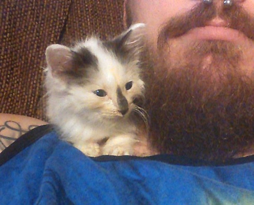 When they met, the kitten snuggled up to him on his shoulder for a nap. It was love at first sight.