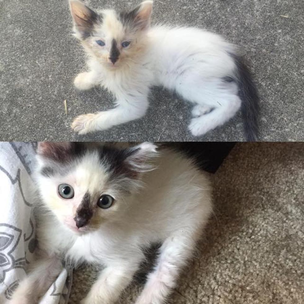 Look at the difference! "The day he was found to today. Little guy has made an awesome recovery and is full of energy. His weight is normal, curiosity is strong, and he loves to attack his big brother."