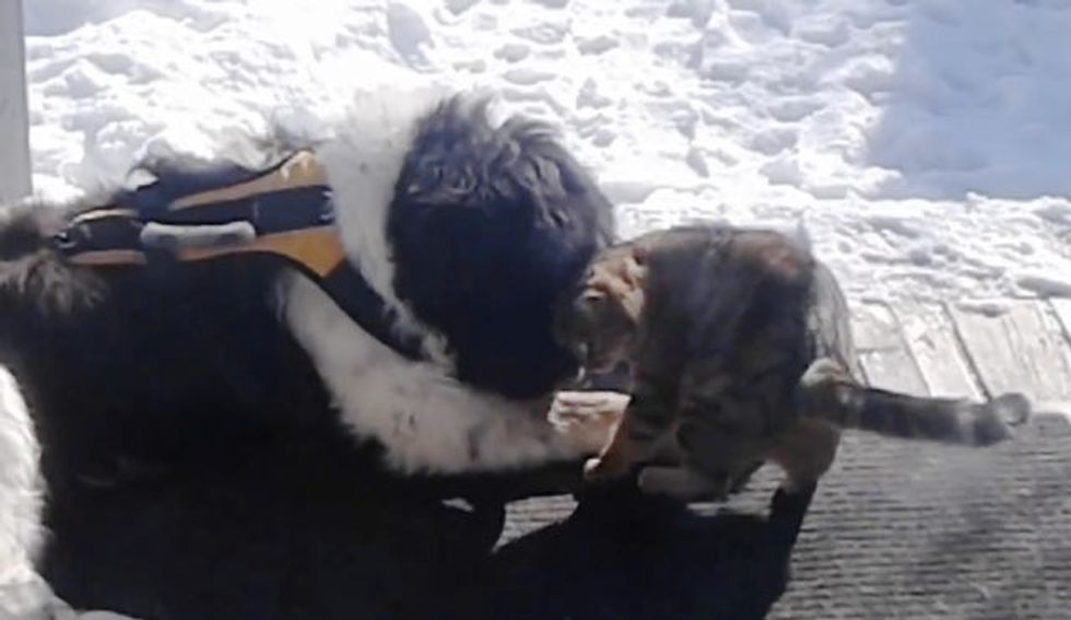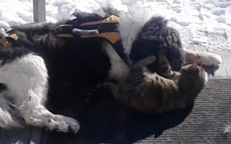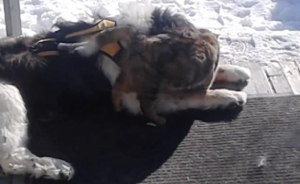 Rowdy the Newfoundland dog was 14 years old when he lost his 2 best Newfoundland dog friends Molly and Annie. "For 2 months he was devastated until Dodger a stray cat found him on our deck," Youtube user Annieke01 said.