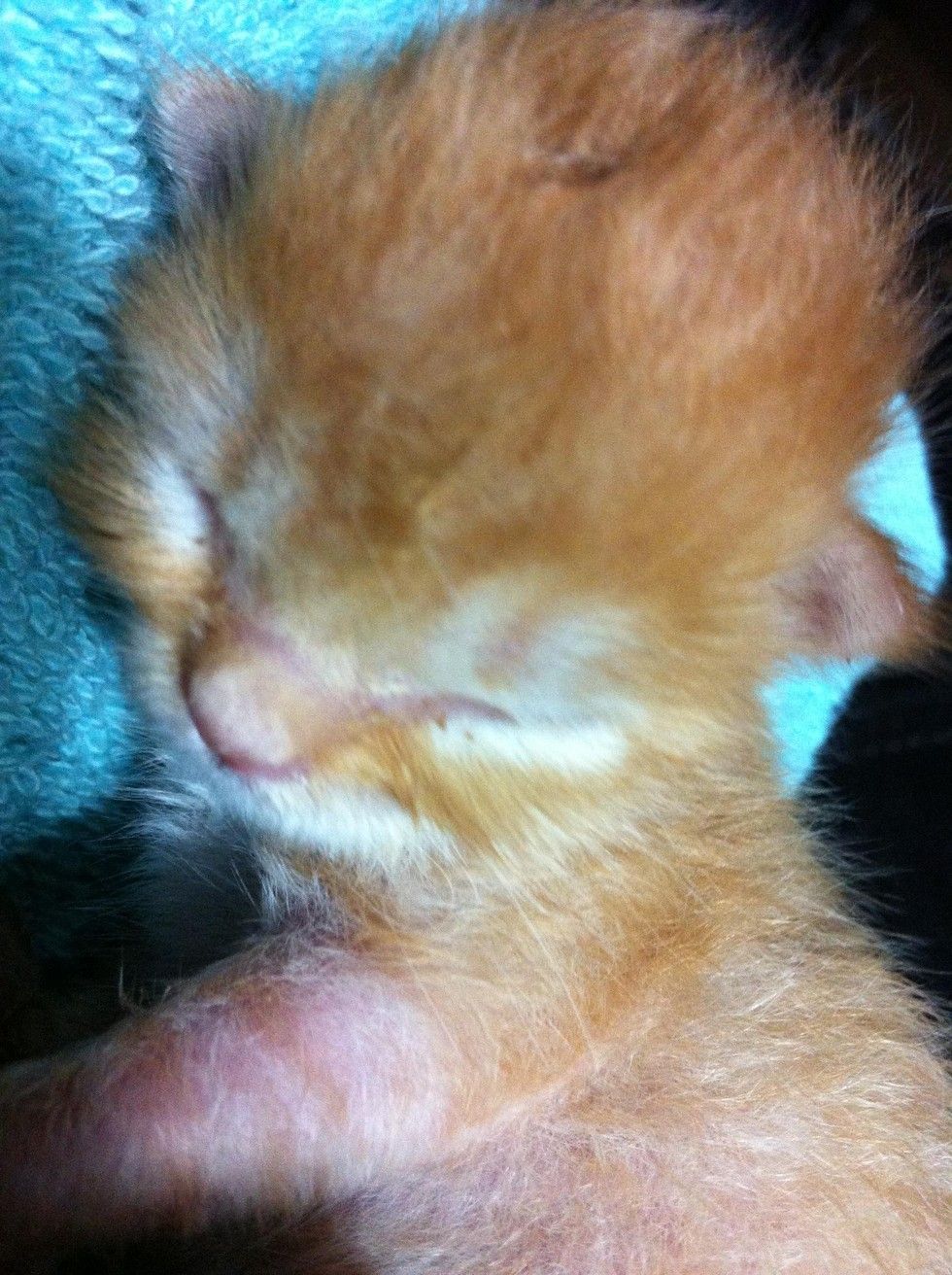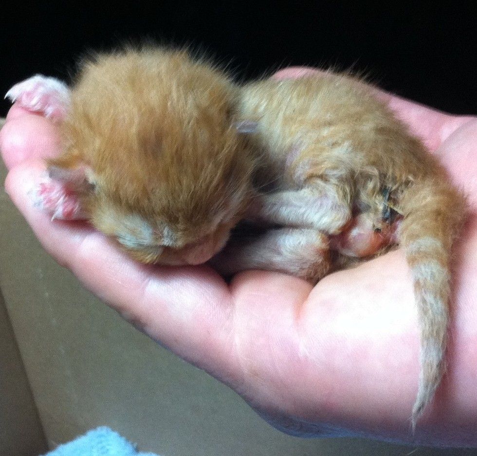 A ginger kitten was spotted under a truck by a good Samaritan. He was so tiny that he could fit perfectly in his rescuer's hand. The little kitten was just a couple of days old with his eyes still closed.