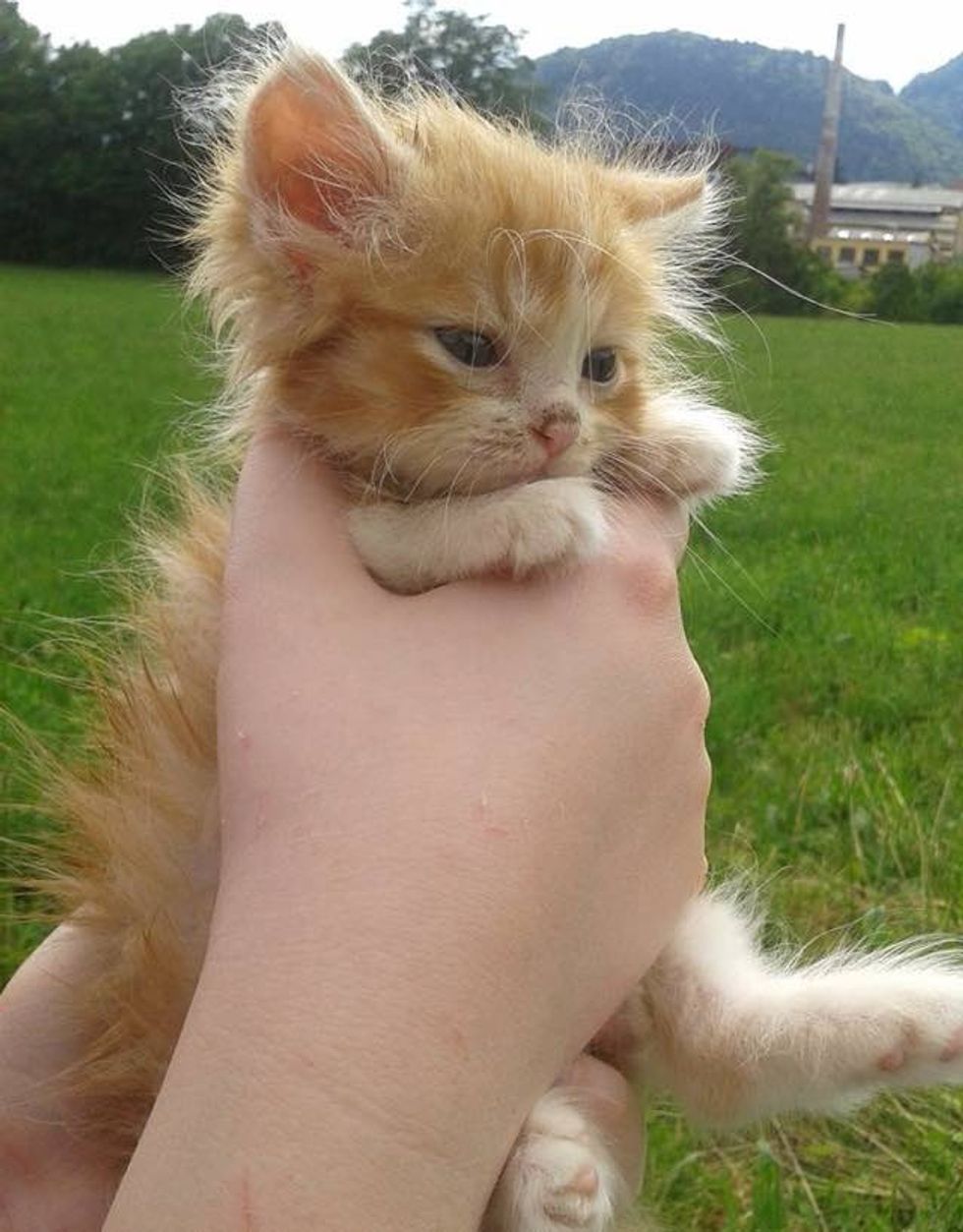 A tiny ginger kitten was lost in the woods, wandering around meowing for her mom.