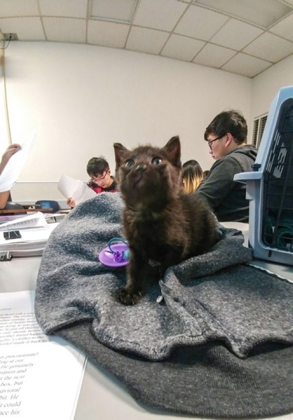 A tiny foster kitten came to rescue a class of stressed out students and gave them lots of purrs and comfort that they desperately needed.