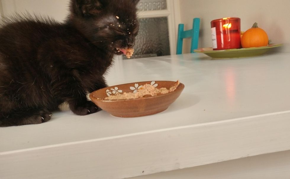 After a long day, little Ony was rewarded with a full bowl of her favorite canned food.