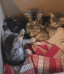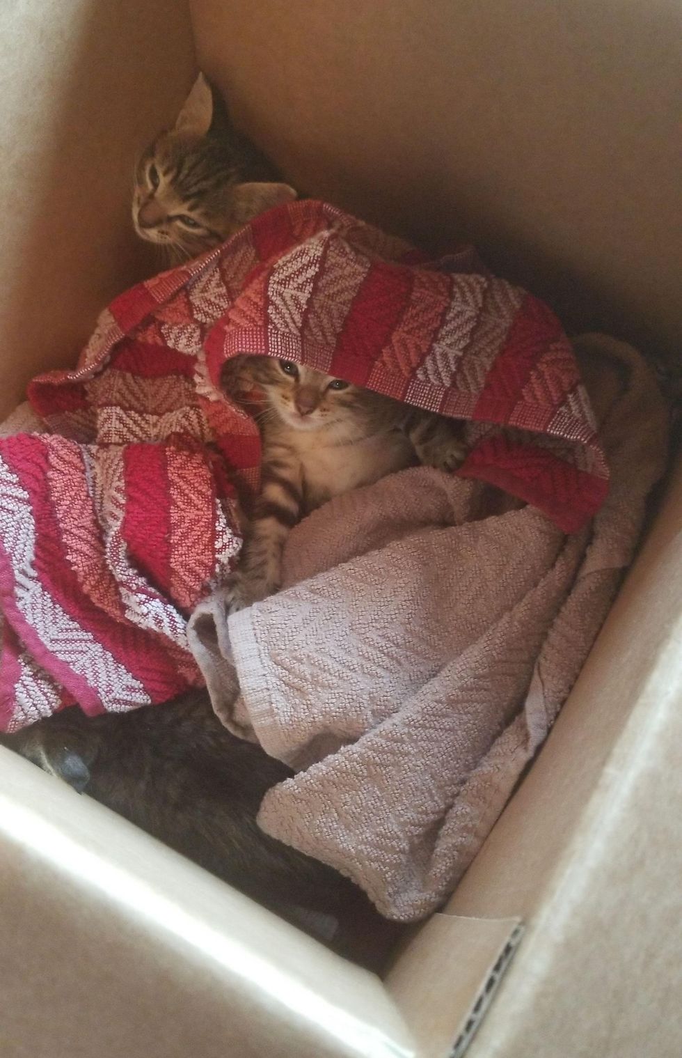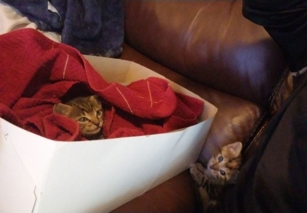 The other kittens were huddled up on a patio by an apartment so she quickly scooped them up and put them in a box.