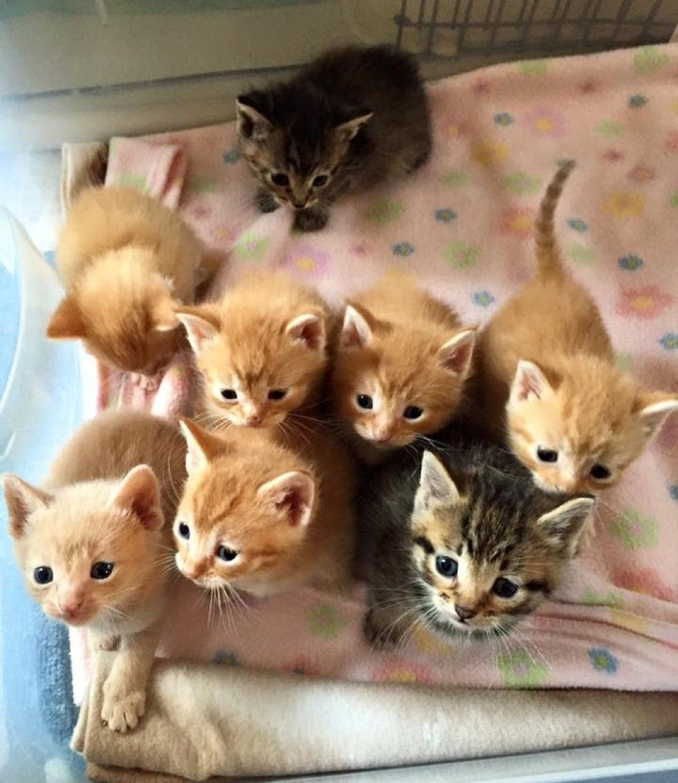 Three slightly bigger kittens are from one litter and the rest are from the other.