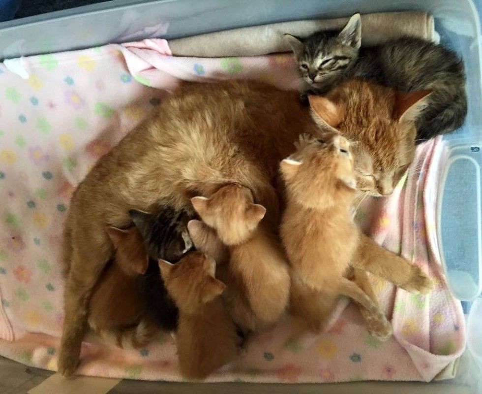 The mamas care for each other's babies with unconditional love. You can support their rescue efforts by following Here Kitty Kitty Rescue on Facebook.