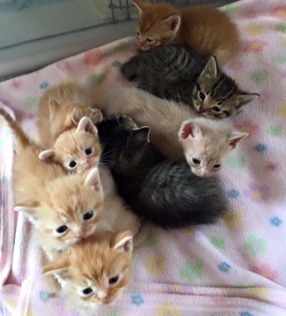 Two abandoned cat mothers were found in a garage. When they were turned into the shelter in a box, they clutched together with their eight tiny nursing kittens just days apart in age.