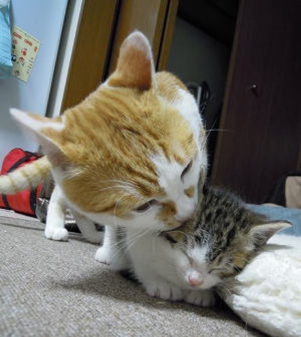 When a tiny motherless kitten came to his new home, he was welcomed by a ginger cat with open paws. The bigger kitty adopted the little ball of fur and started licking him and loving him like family. It was love at first sight.