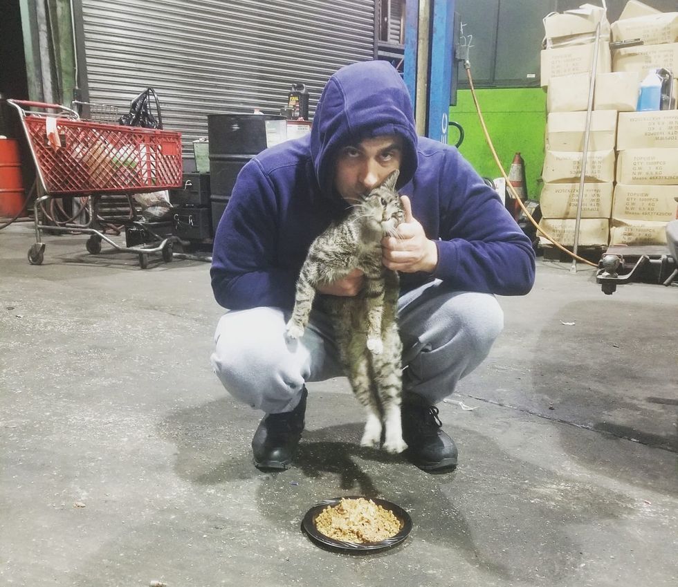A friendly stray cat came running when a rescuer who had given him food, came back for him.