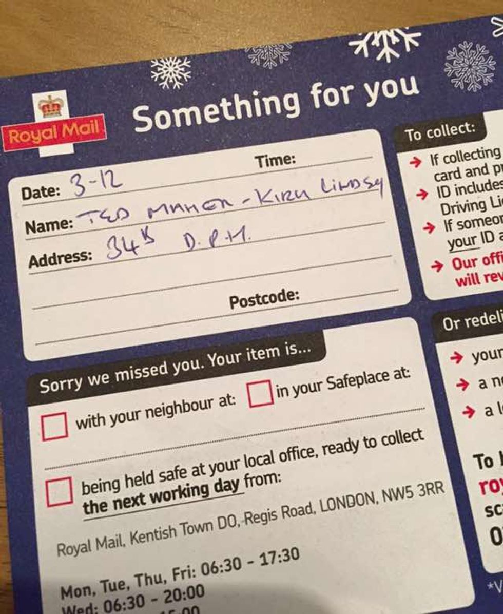 Ted's human Brittany Maher-Kirk missed the delivery so went to the post office, but found herself in a bit of a pickle.