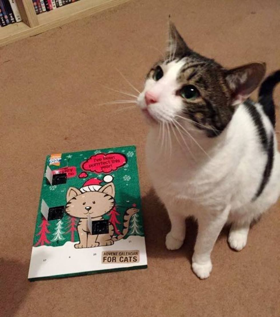 The calendar is made specifically for cats filled with cat treats. "He loves it — when he sees it he meows and begs for the treat!"