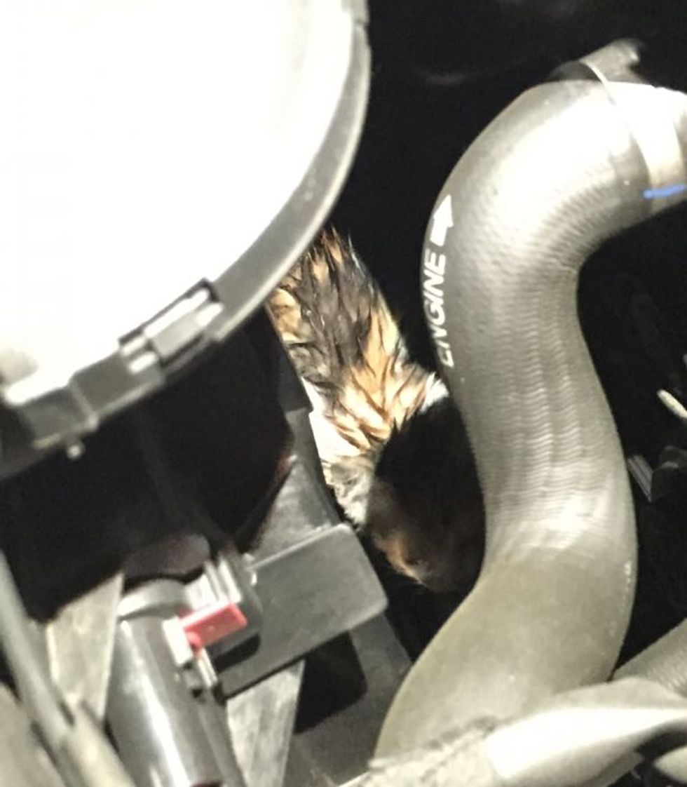 He towed his car to the nearest dealership to have his engine dismantled so that they could free the kitty inside.