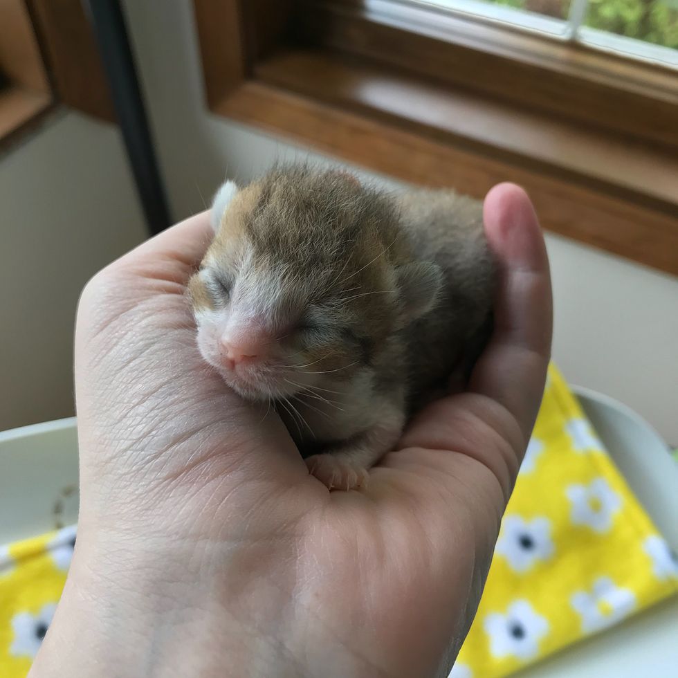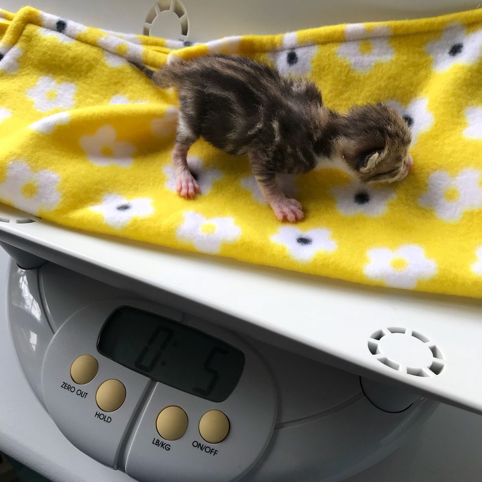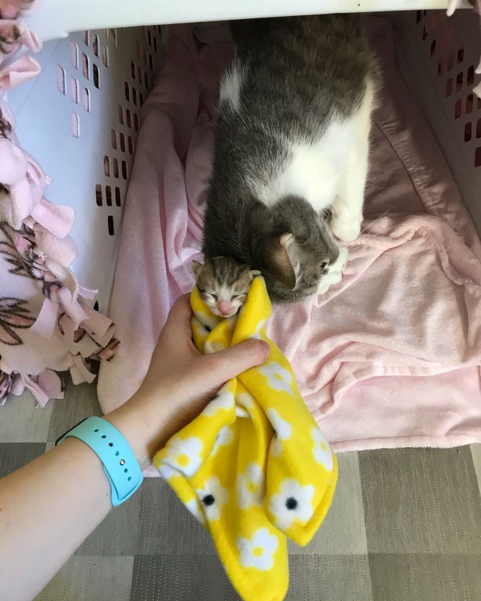 While two of the kittens (Coco and Fritter) were growing, the tiniest baby Maple stayed small. Despite their best efforts, she passed away a week later. Mama kept her little runt loved till the very end.