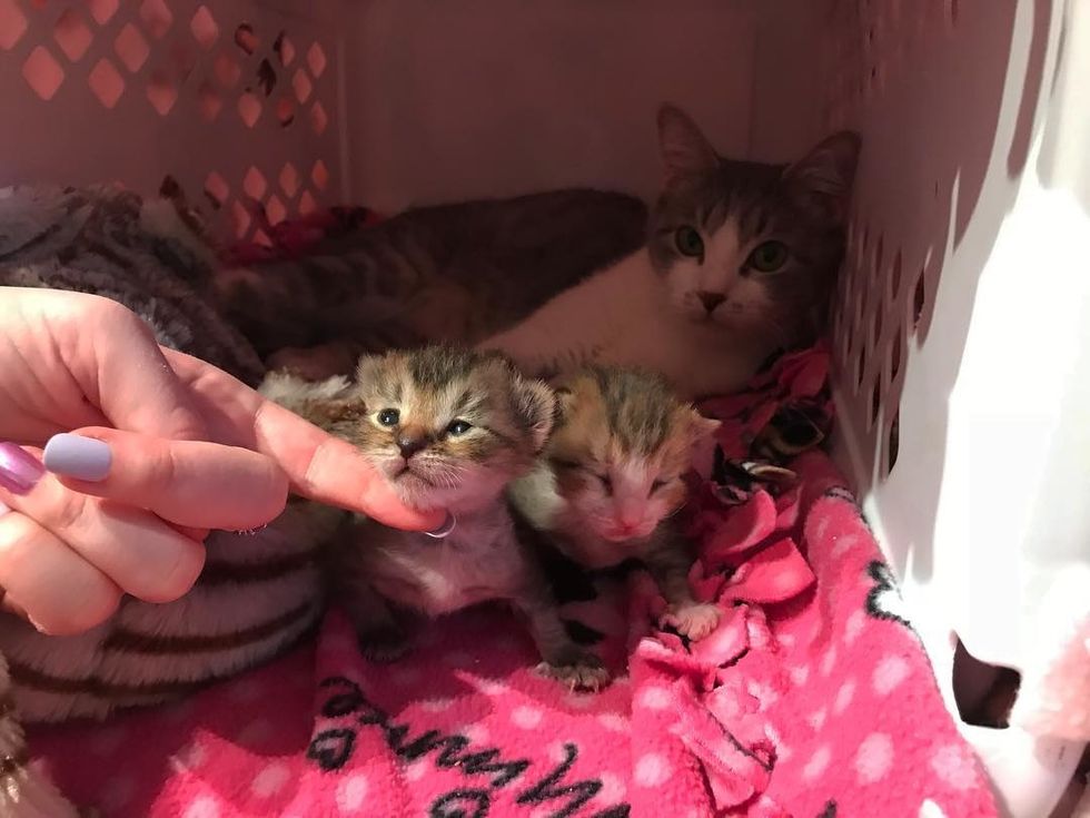 A stray cat was rescued along with her three newborn babies. The sweet mama named Sprinkles kept her babies by her side and refused to go anywhere without them.