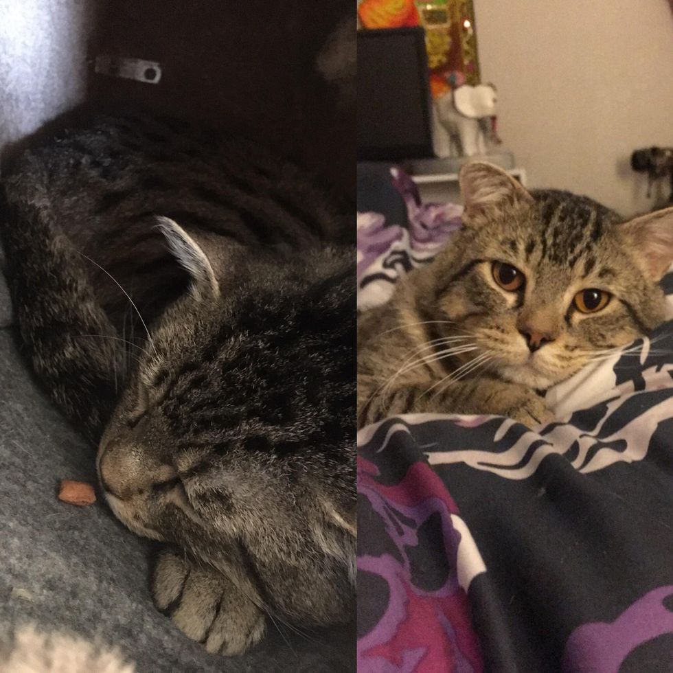 "Left: A sad quiet guy who hid away from everyone else. Right: One week later, as a lovable, purring machine."