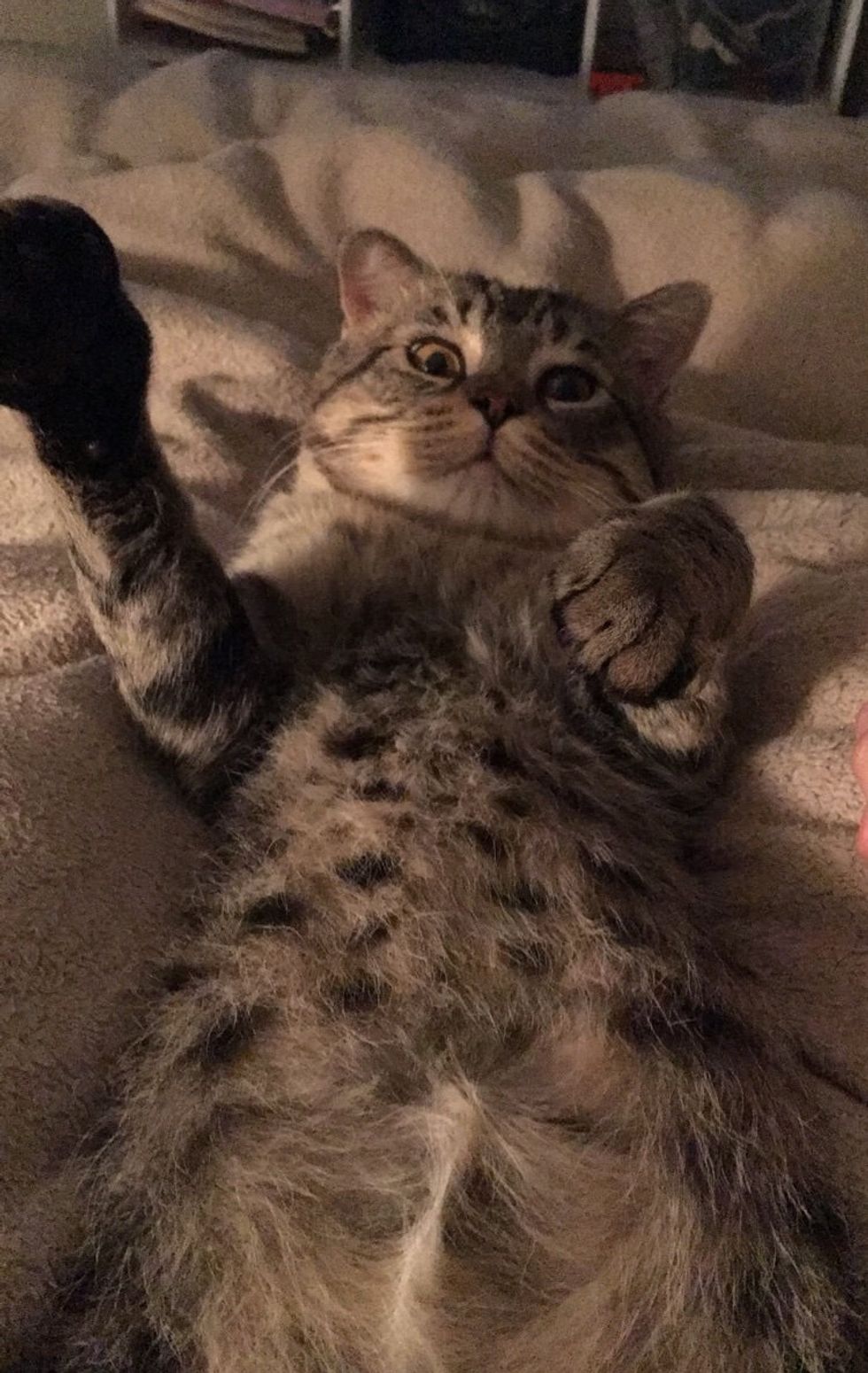 "Vincent likes to be cradled like a baby once in a blue moon when I'm in bed. He will lay on his back and expect me to scoop him into my arms and hold him like a newborn.