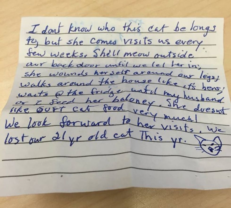 Nala the cat went out to play in the neighborhood the other day but surprised her human when she came home with a note attached to her.
