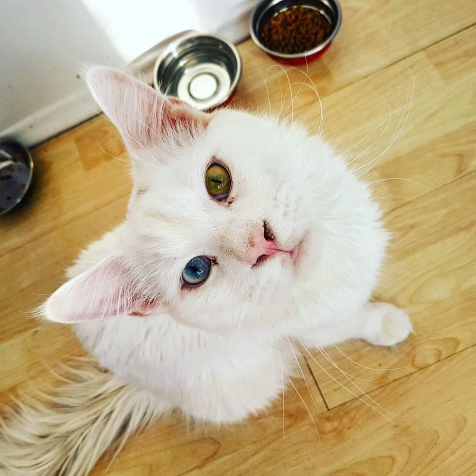 He has a pair of odd eyes, one blue and one hazel.