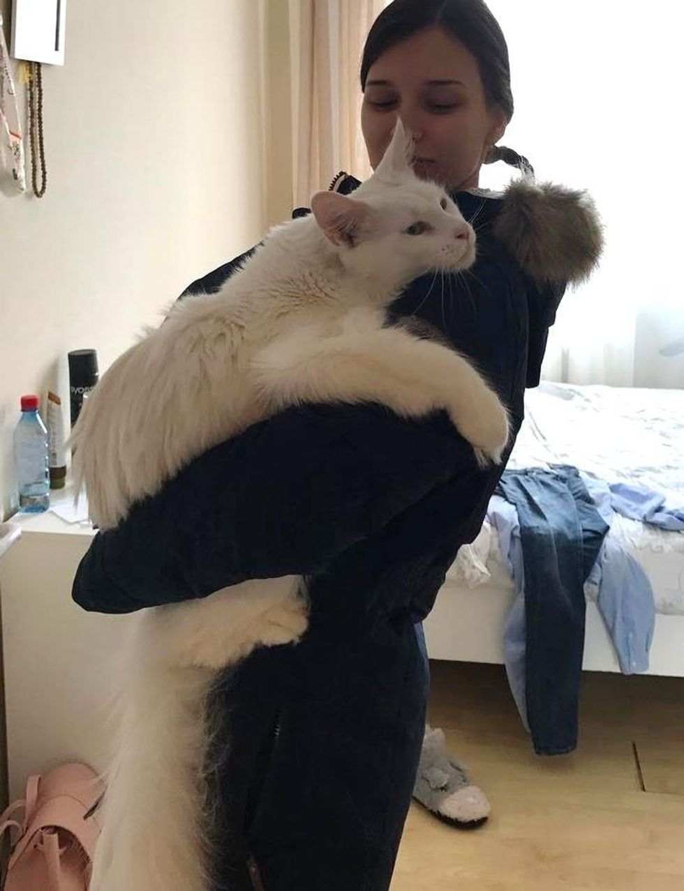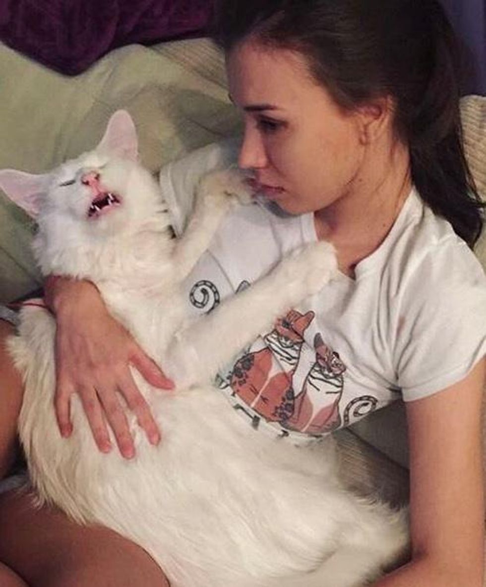 "He likes to sit in my arms all the time. He doesn't like to be alone, and always follows me wherever I go, even the bathroom," Tihon's human mom told Love Meow.