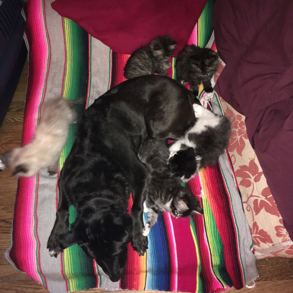 Zuca gives these orphaned kittens the motherly love they need to thrive.