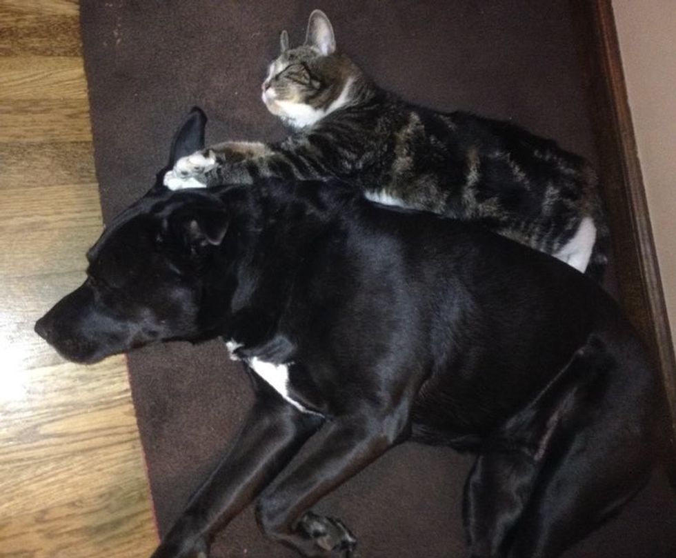 It took Zuca some time to adjust to her new life, but one thing she never had trouble with - Ronda's cats. She immediately took a liking to her feline friends, and one of them became her best buddy - Stout.