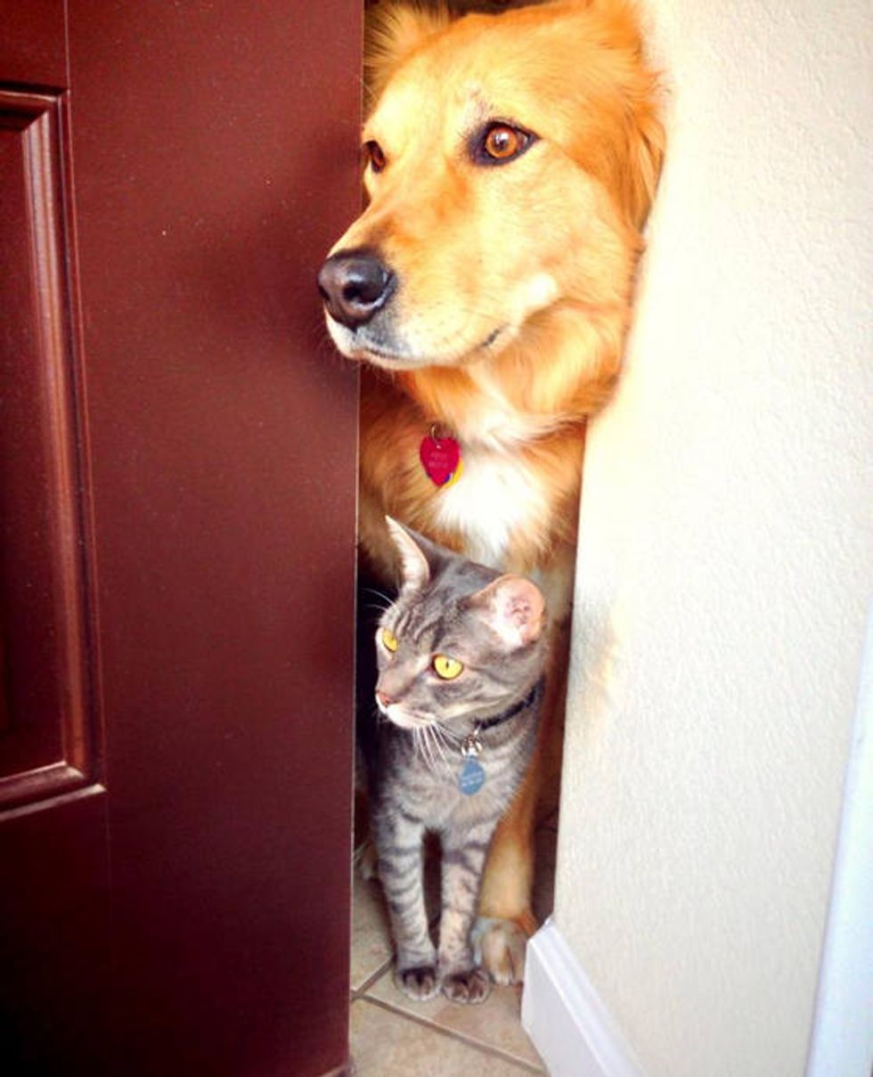Paxton the kitten and his best friend Piper the dog, waiting for their human at the door