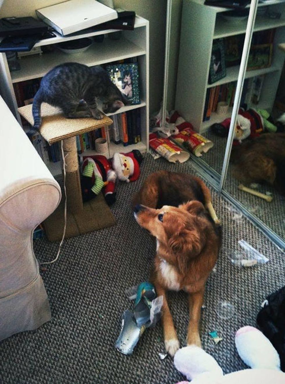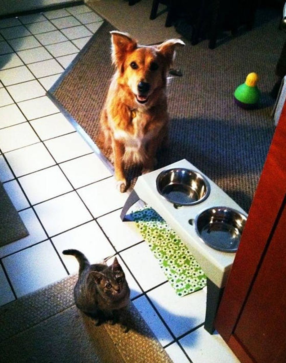 "He was a feral born rescue kitty (Paxton), but he bonded quickly to my dog when he was little and basically just mimics her, shadows her in how she interacts with humans. It took him 6 months, but he will now come and greet all visitors to our home," said the human via reddit.