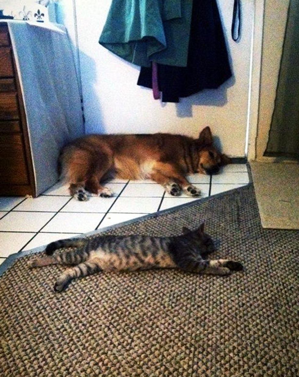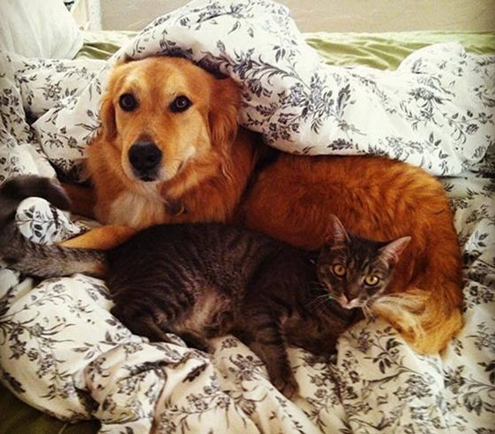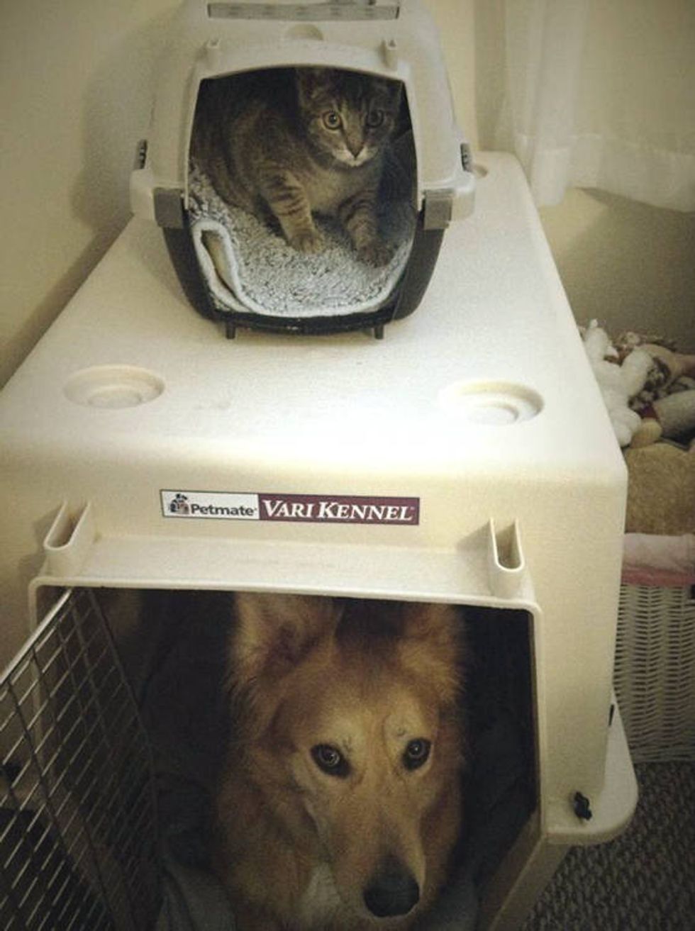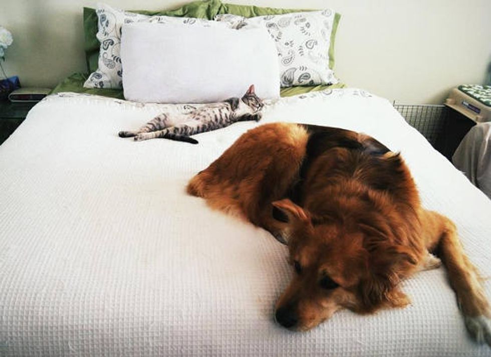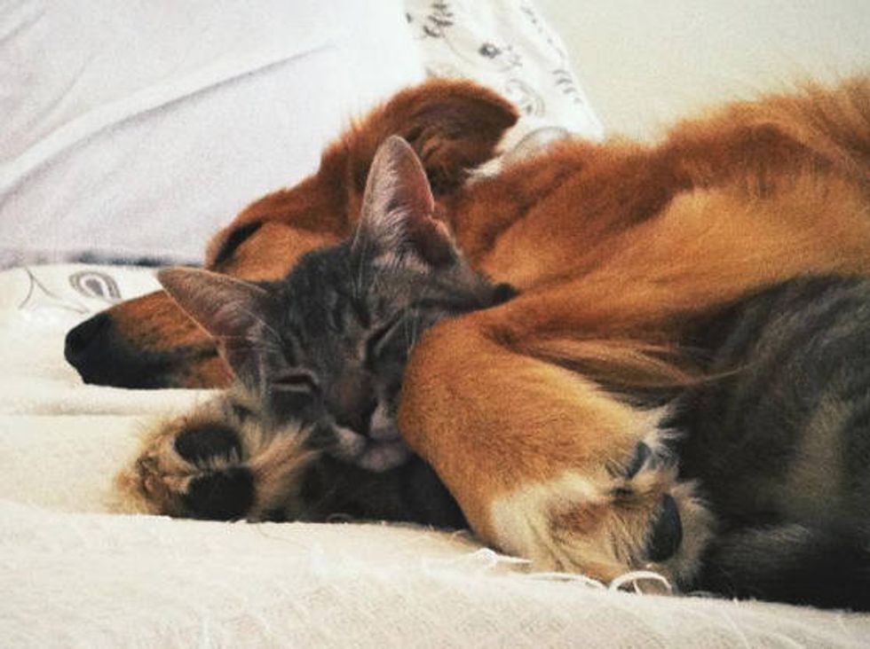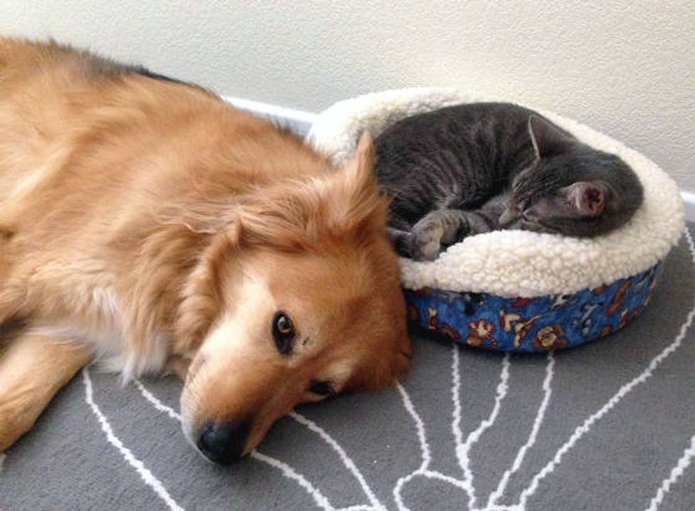 "...the kitten became boss right away! He swiped her nose and she yelped… After a few weeks of her slinking around like a battered dog, something changed between them and they started cuddling, playing and seeking each other out. It's been an amazing dynamic to watch!"