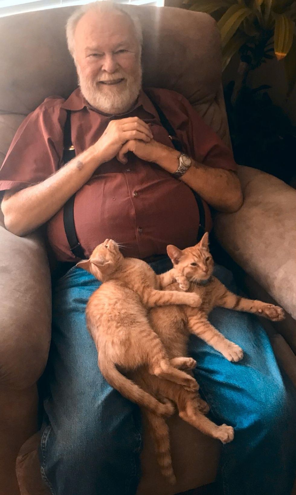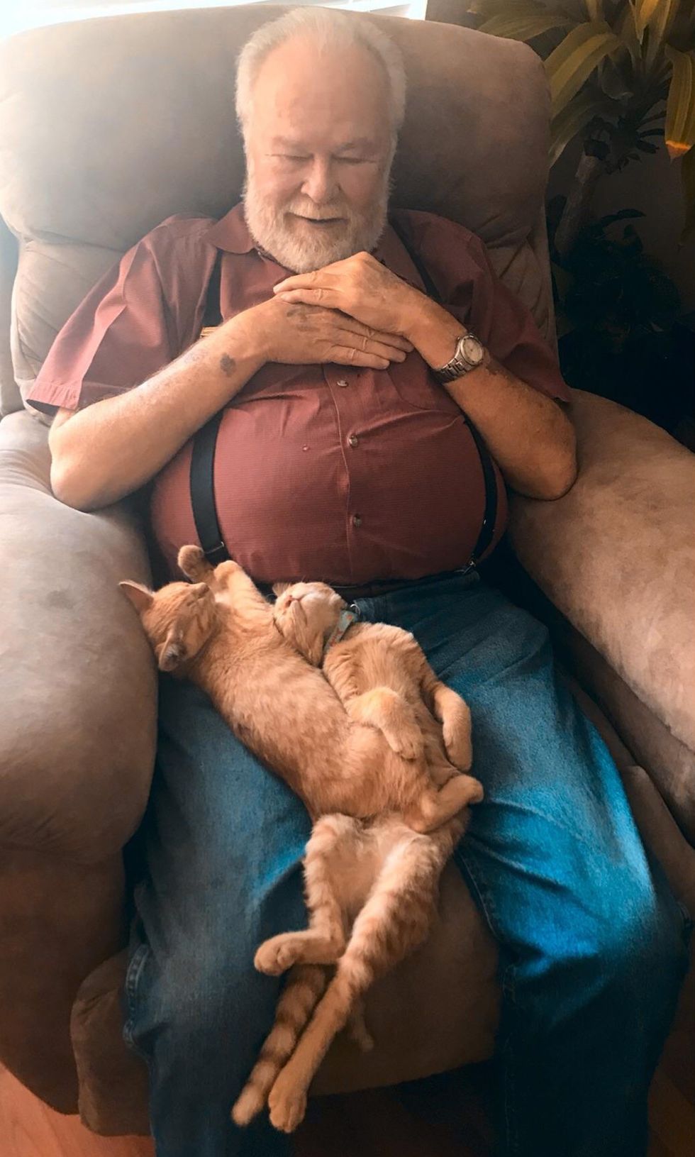 Two rescue kittens curled up in their foster grandpa's lap and didn't want to let him go.