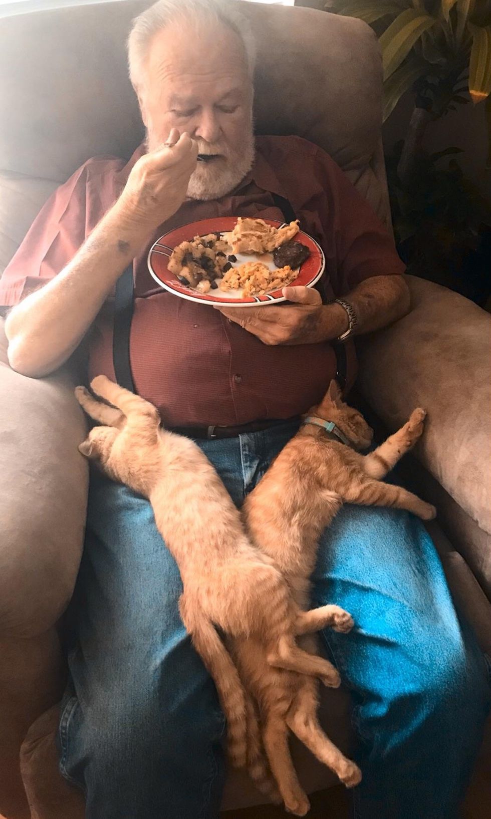 When she introduced the kittens to her father, who is an animal lover with a big heart, the kittens quickly gravitated towards him and decided that he would be their designated snuggle buddy that day.