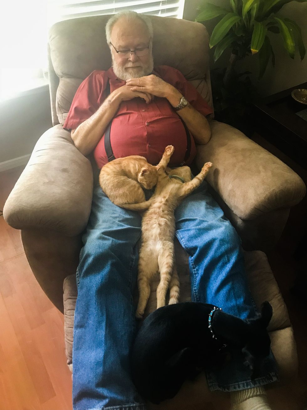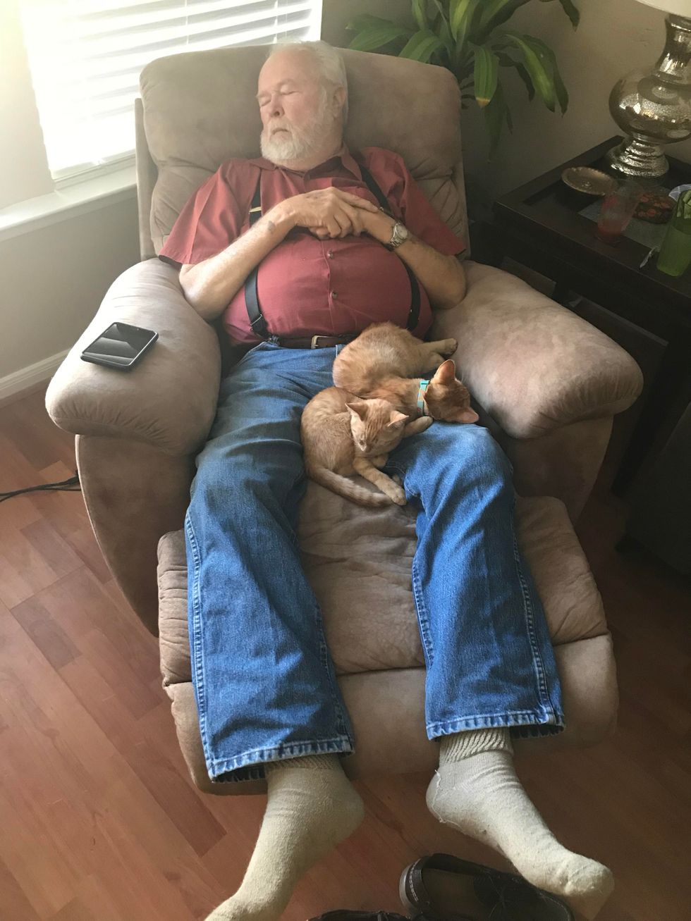When he sat down in his chair, the two ginger boys hopped on him. After stretching out those legs and toes, they fell asleep snuggling in his lap, purring aloud.