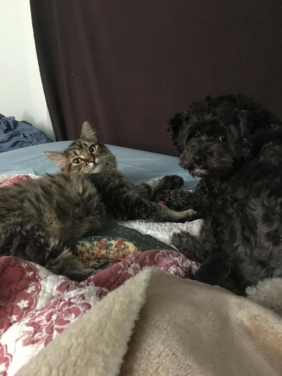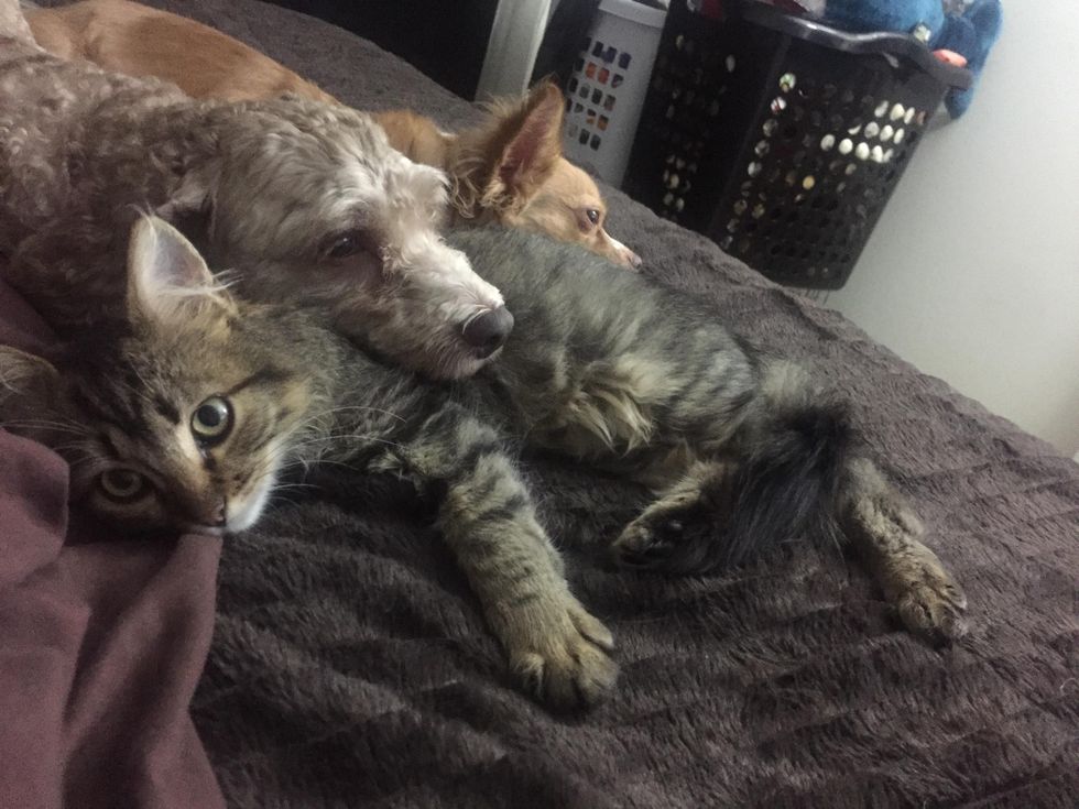 "We love Cheshire so much. He gets along marvelously with all of our dogs as well and our female dog claimed him as her 'pup' and takes time to groom him and watch over him."