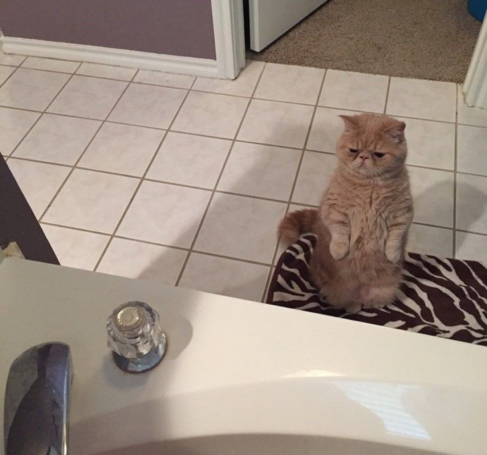He has a habit of waiting by the bath when his humans use the bath tub.