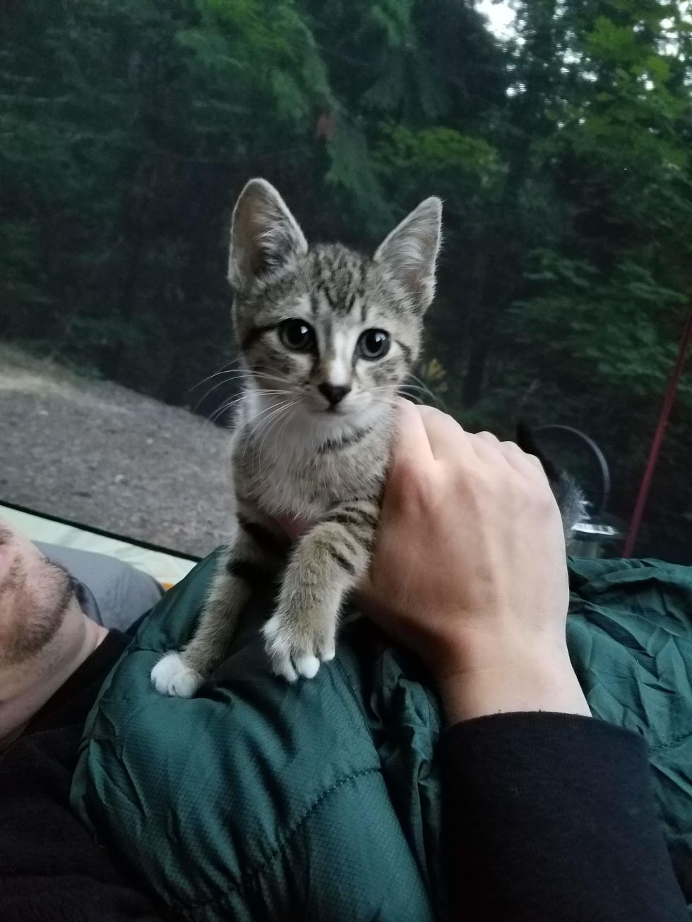 A couple was out camping when they heard something that sounded like a bird. They were surprised to see a tiny stray kitten chirping at them for attention.