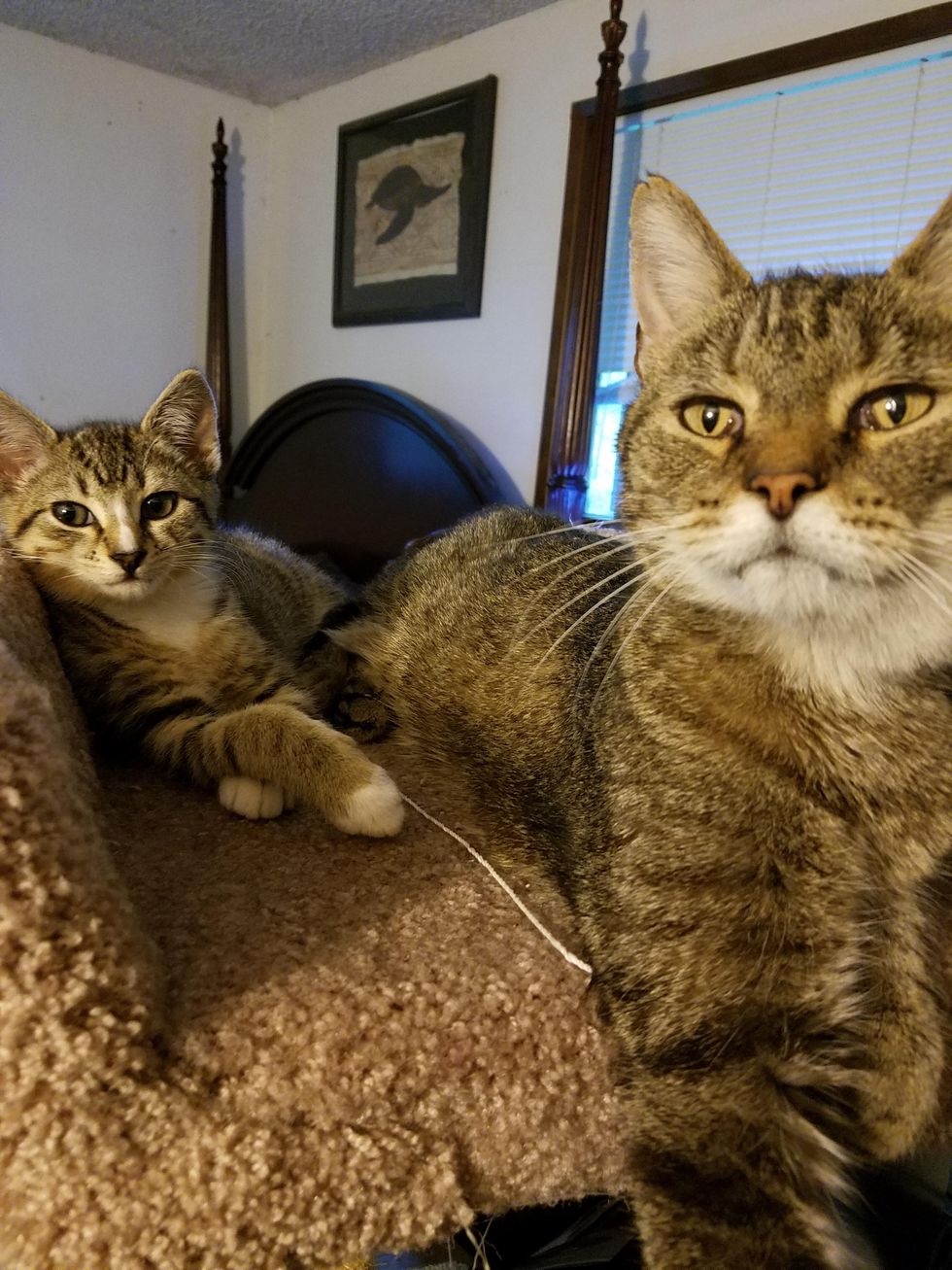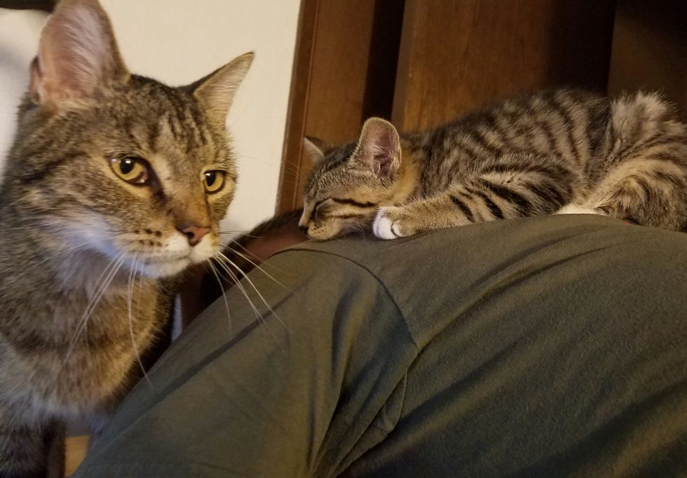 The couple introduced Birdy to her new big brother, Bob, who is also a tabby. She was a bit nervous at first and climbed on her human dad's back for some comfort.