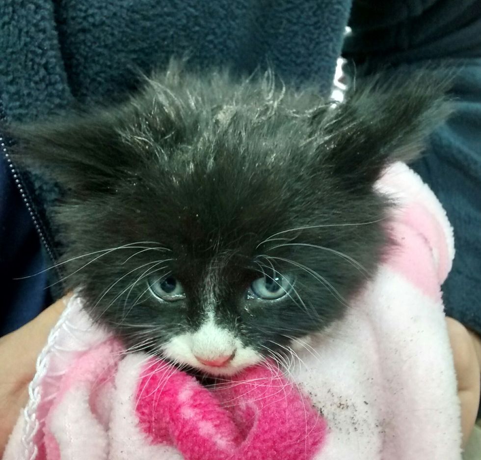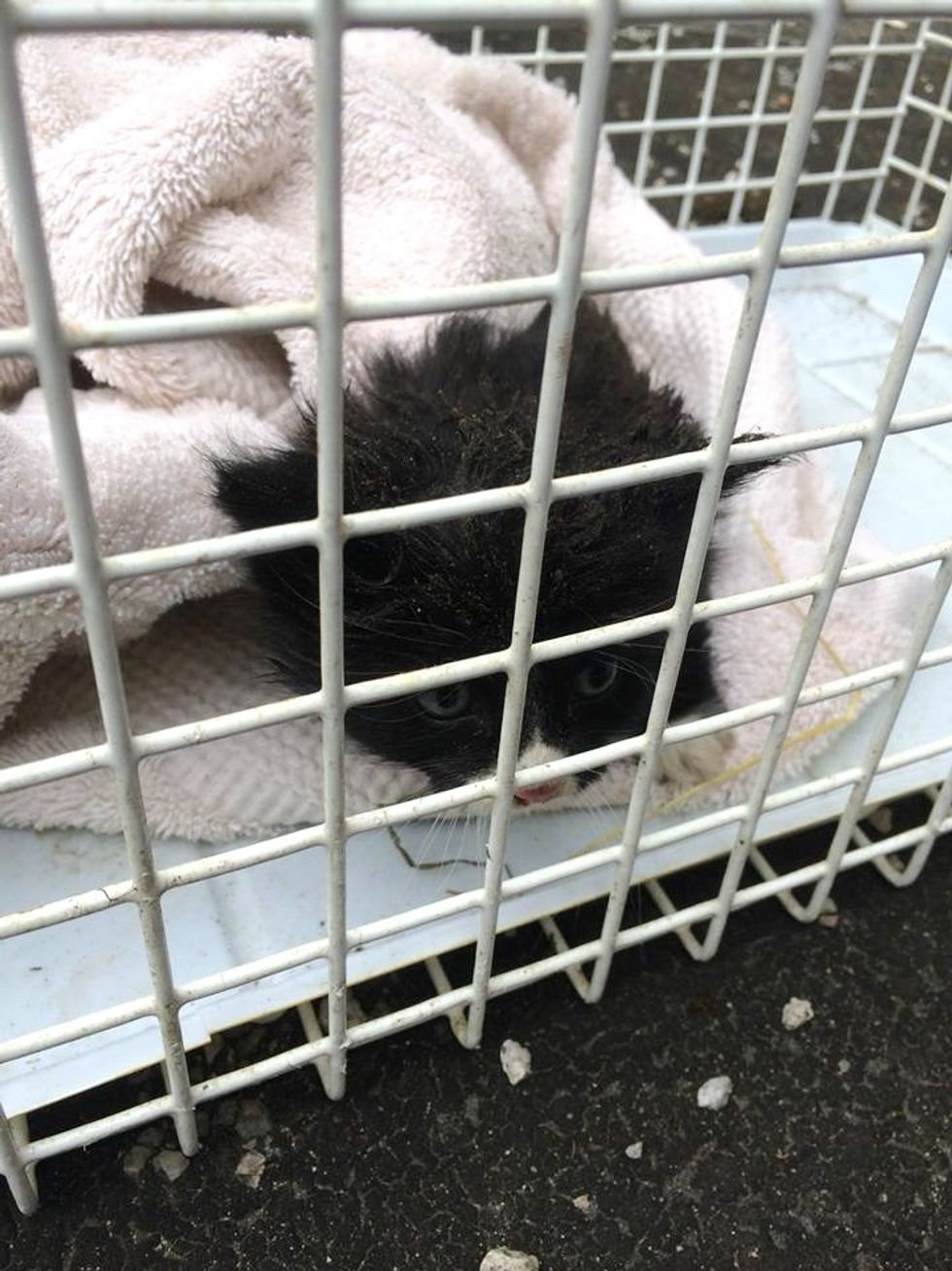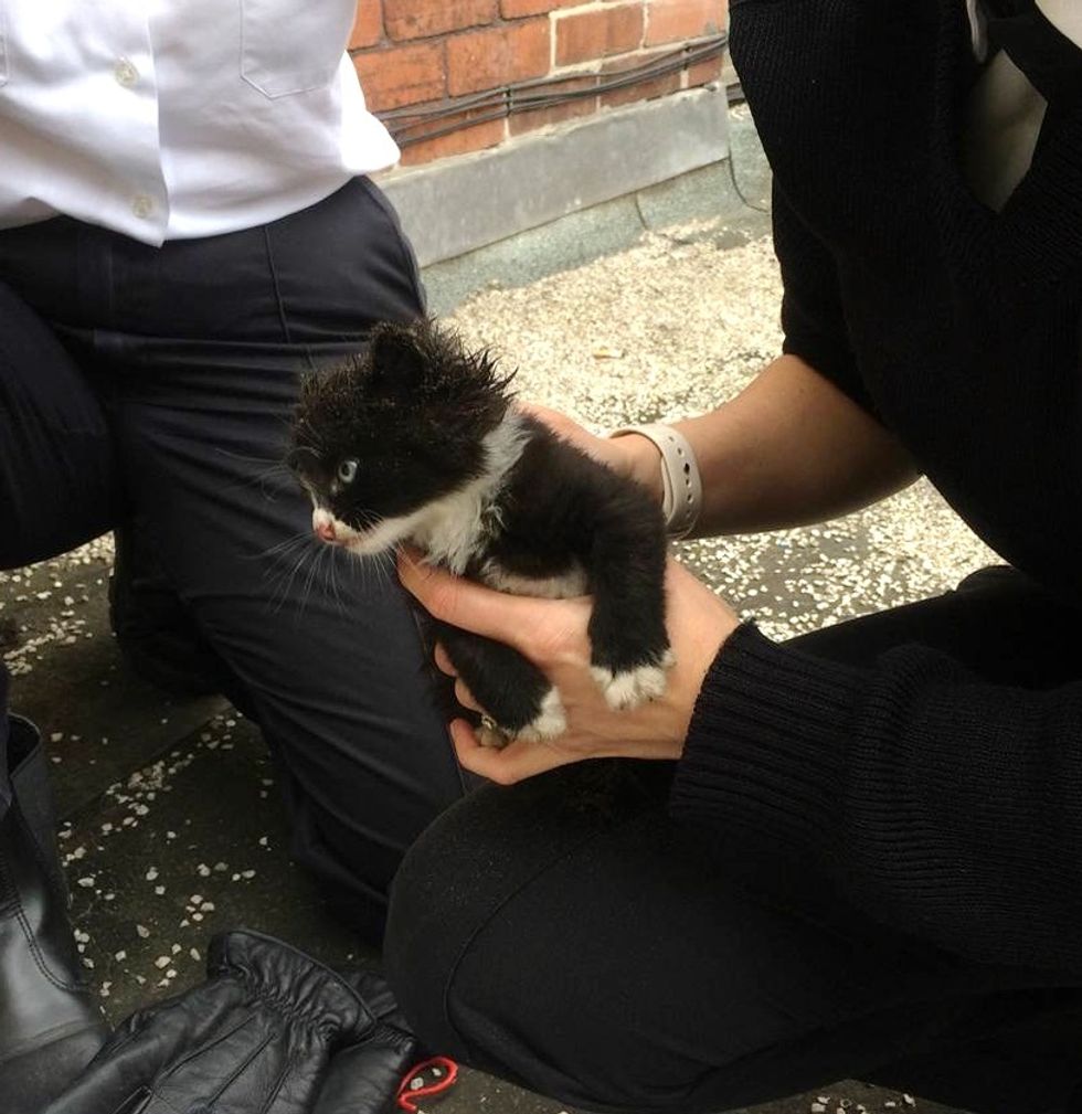 "This poor little kitten had fallen off the pub's flat roof into a deep gap with no way out but upwards," Sandra said in a newsletter shared with Love Meow.