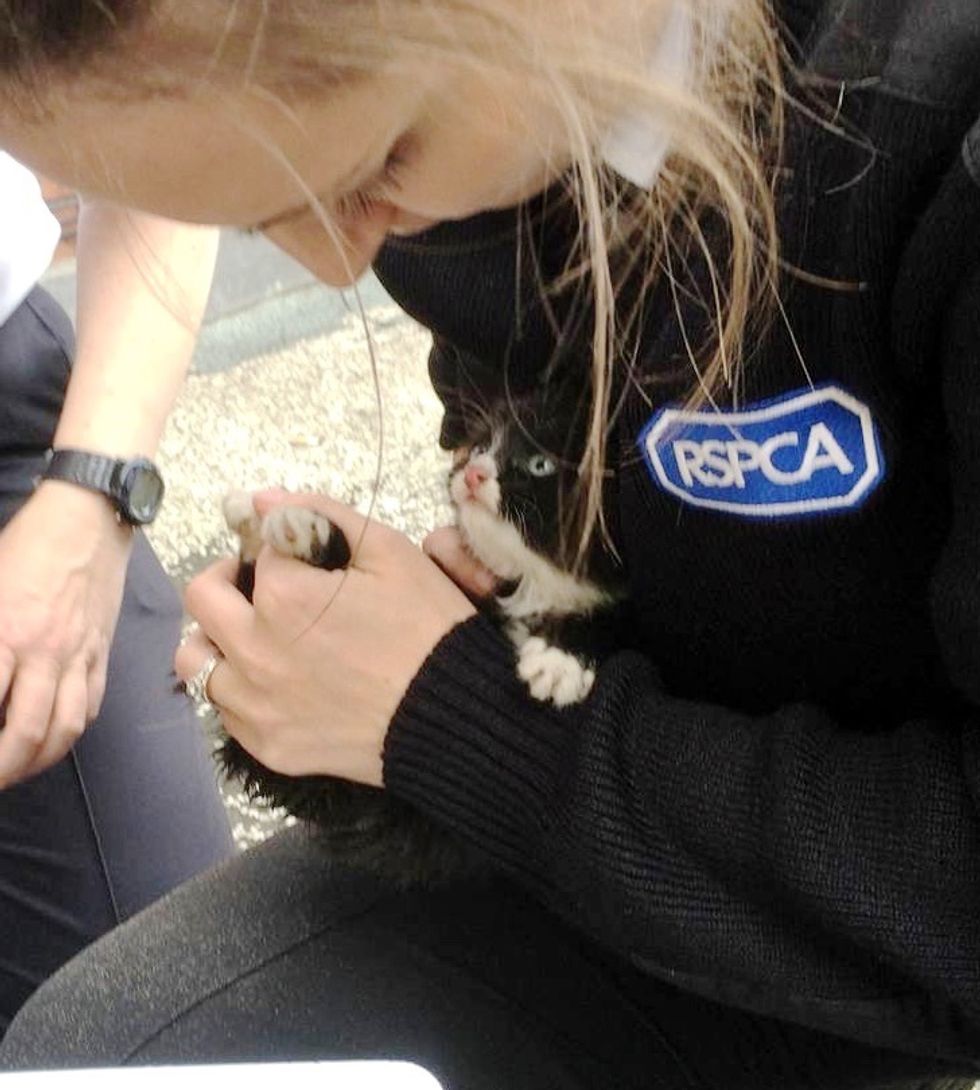 It was a 2-hour long rescue mission which ended in a kitten snuggling in a RSPCA rescuer's arms. The kitten was covered in dirt but was able to calm down after getting a few pets.