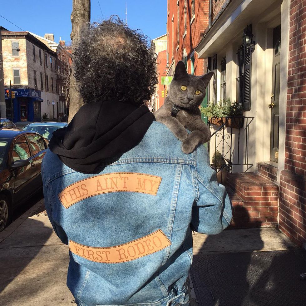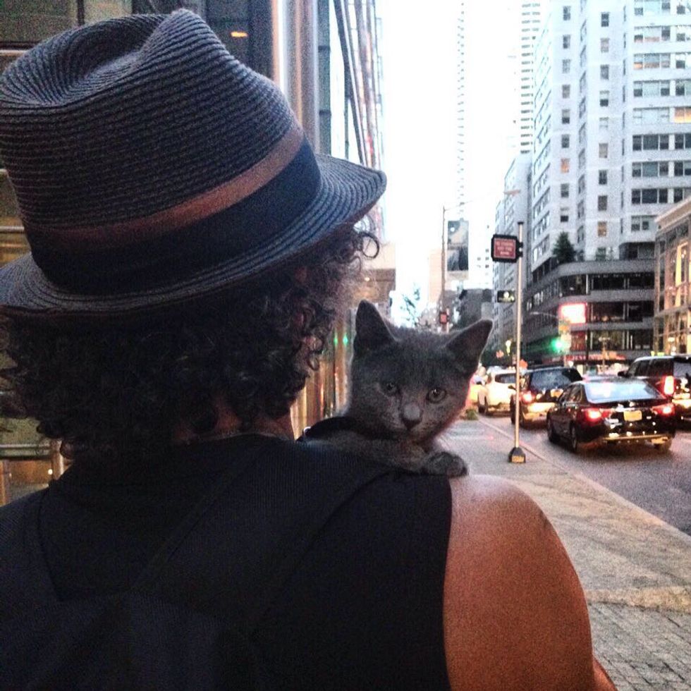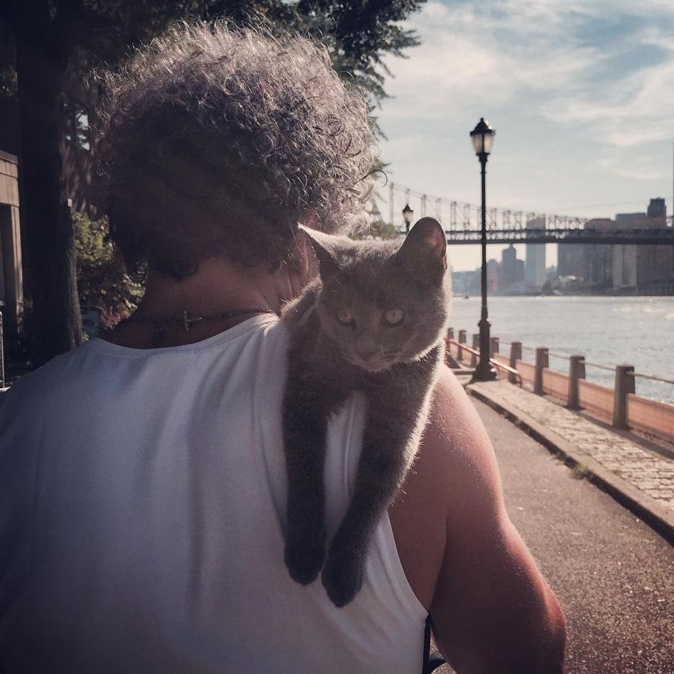 Stinkie loves to be carried around on her cat dad's shoulder.