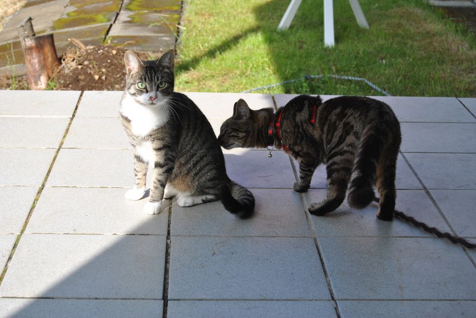 After exchanging a few sniffs with the neighbor cat, they quickly became friends. They spent the whole afternoon together until Neighbor Cat retreated home. Next day, the same kitty showed up on their porch, and he just kept coming back.