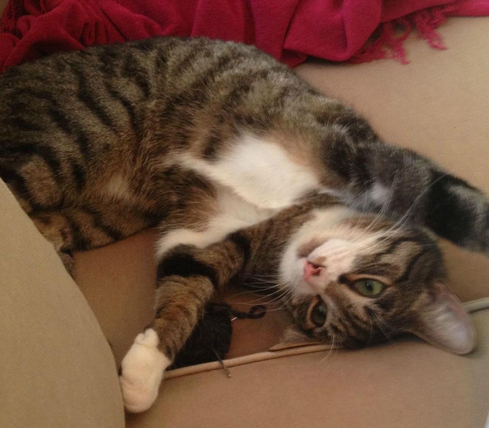 "Loki shows up mid-morning either at the back door meowing, or at the window, and is excited to come in and play."