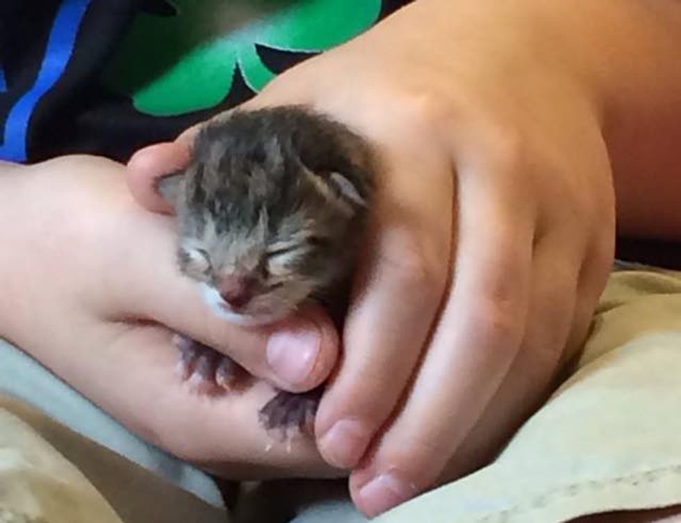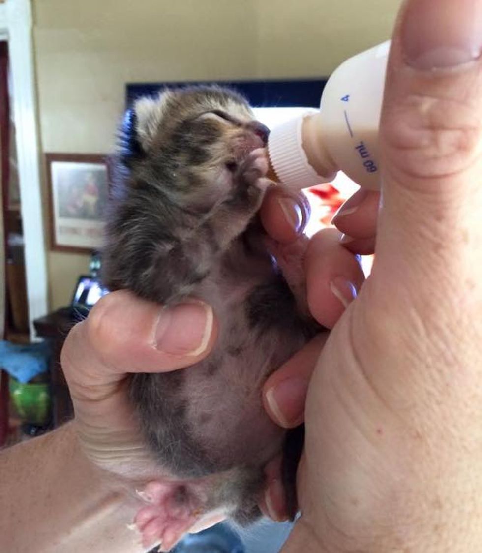 "Hubby was out of the country but coming home the next day. On his way home he got kitten milk, bottles and... get this... little fuzzy mice toys. (as if she could play with them at one day old)."