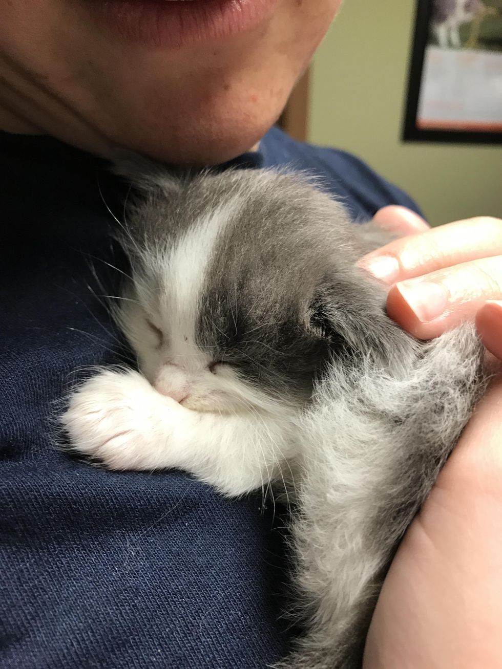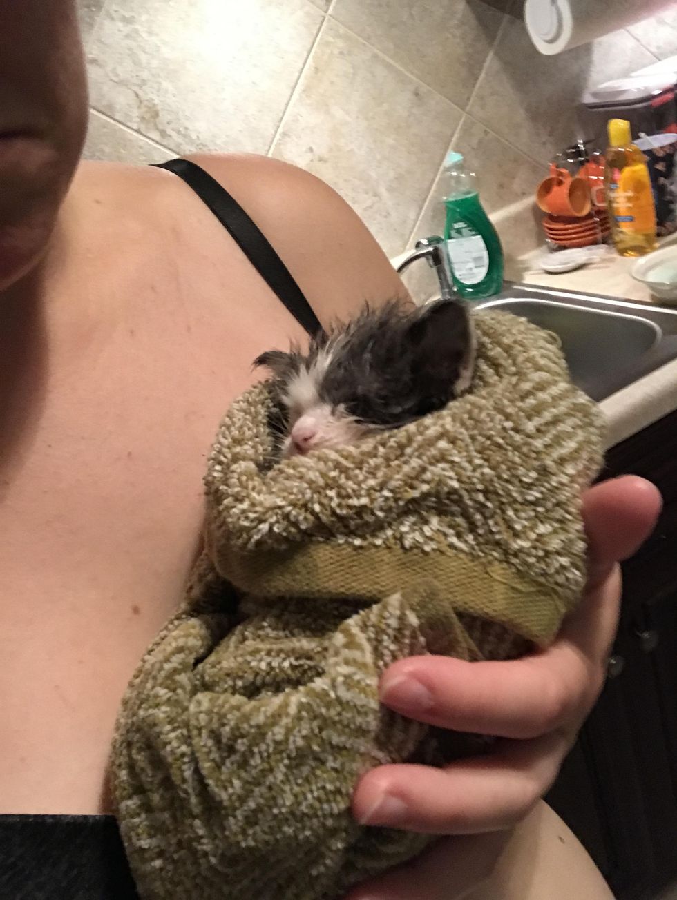 A little motherless kitten fell asleep cuddling with her human after they saved her from an uncertain fate.