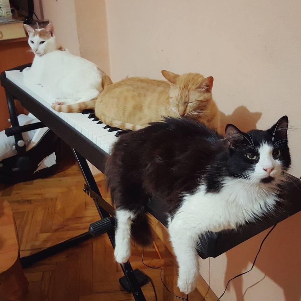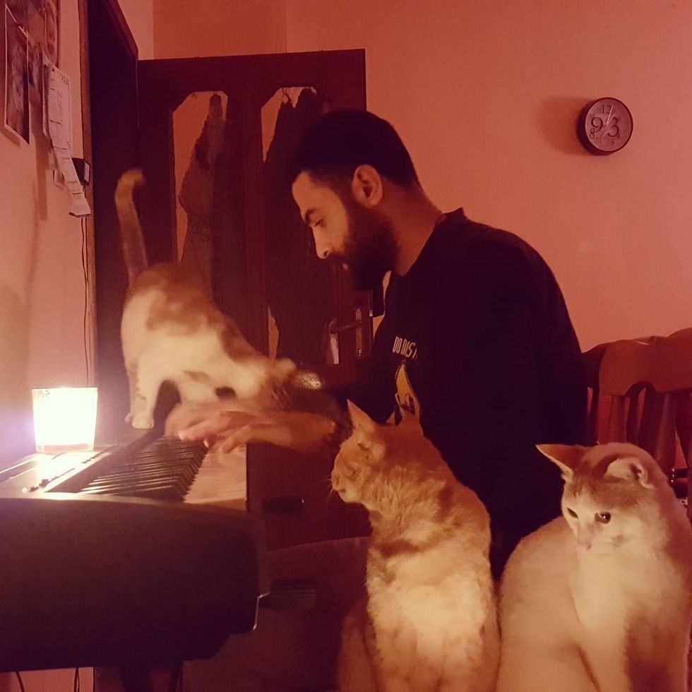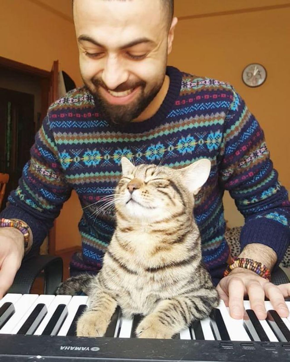 Sometimes they like to play with their human or cheer him on as he continues a beautiful piece.