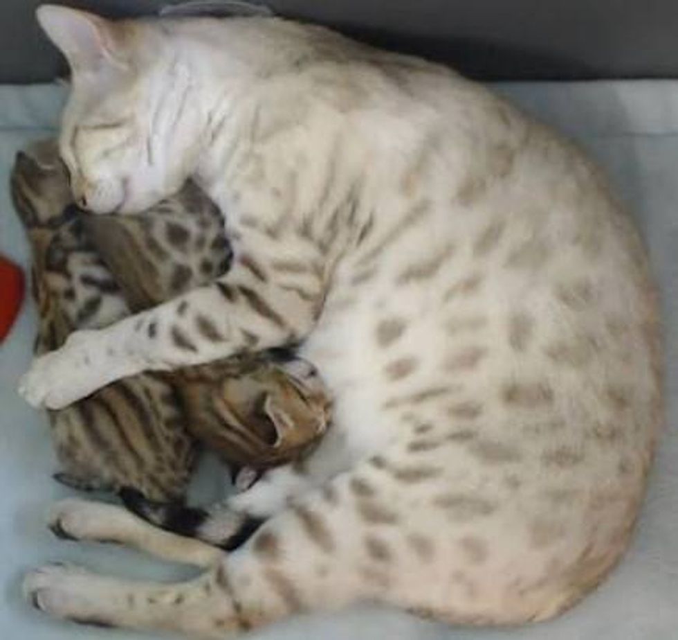 This beautiful Snow Bengal cat had so many kittens taken away from her before she was rescued. When she had her last two miracle babies, she held them in her arms and wouldn't let them go.