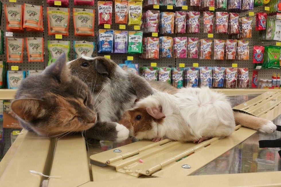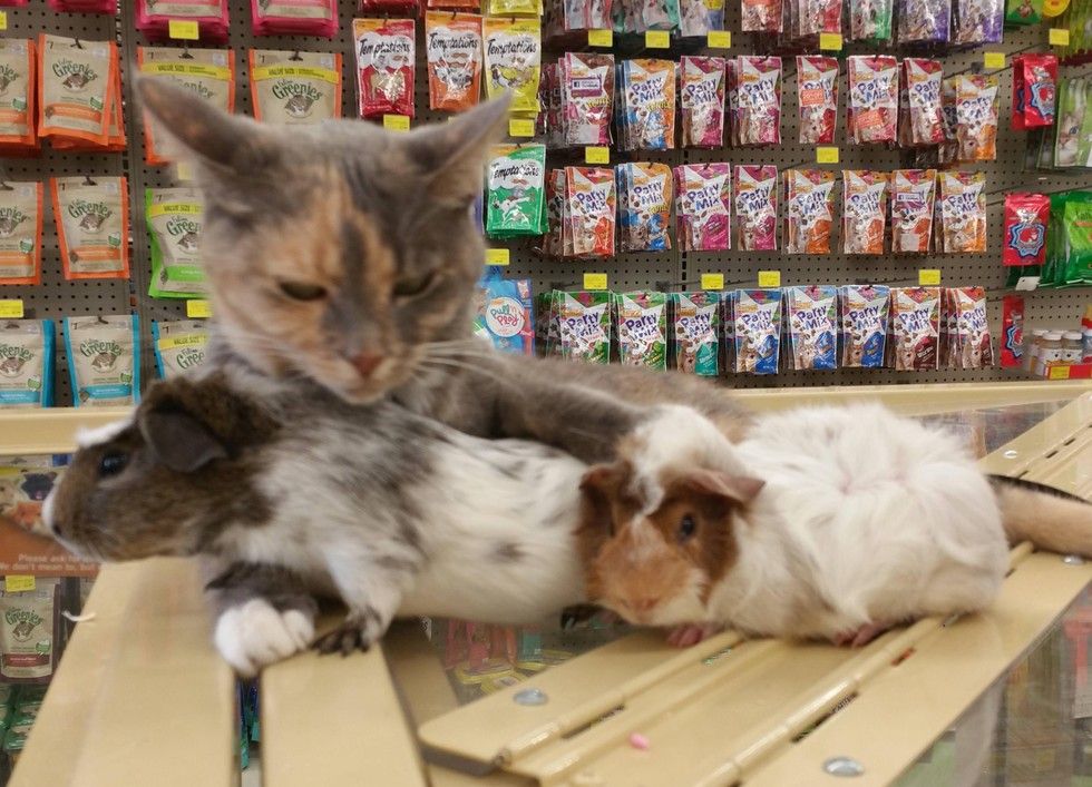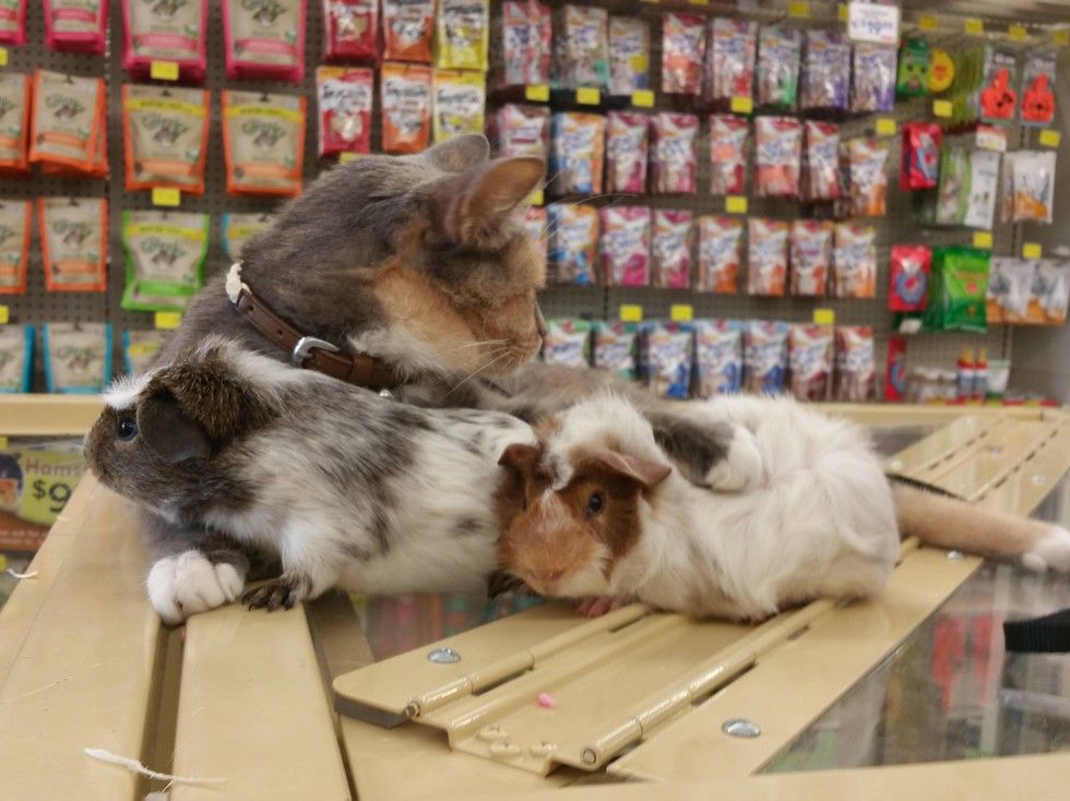 This store cat is very nurturing to other animals. Whenever she's at the store, she demands to cuddle and groom the guinea pigs as if she's their mother.
