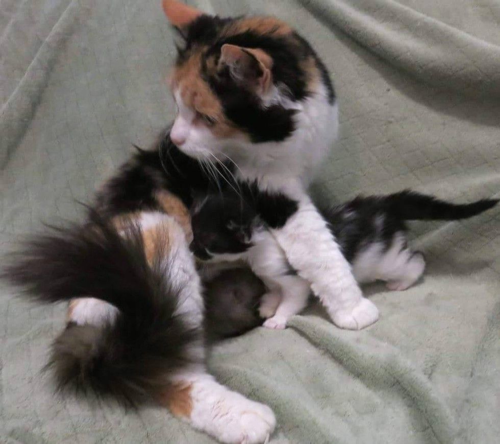 A sweet calico cat asked a family to take her inside their home so she could have a safe place for her only baby.